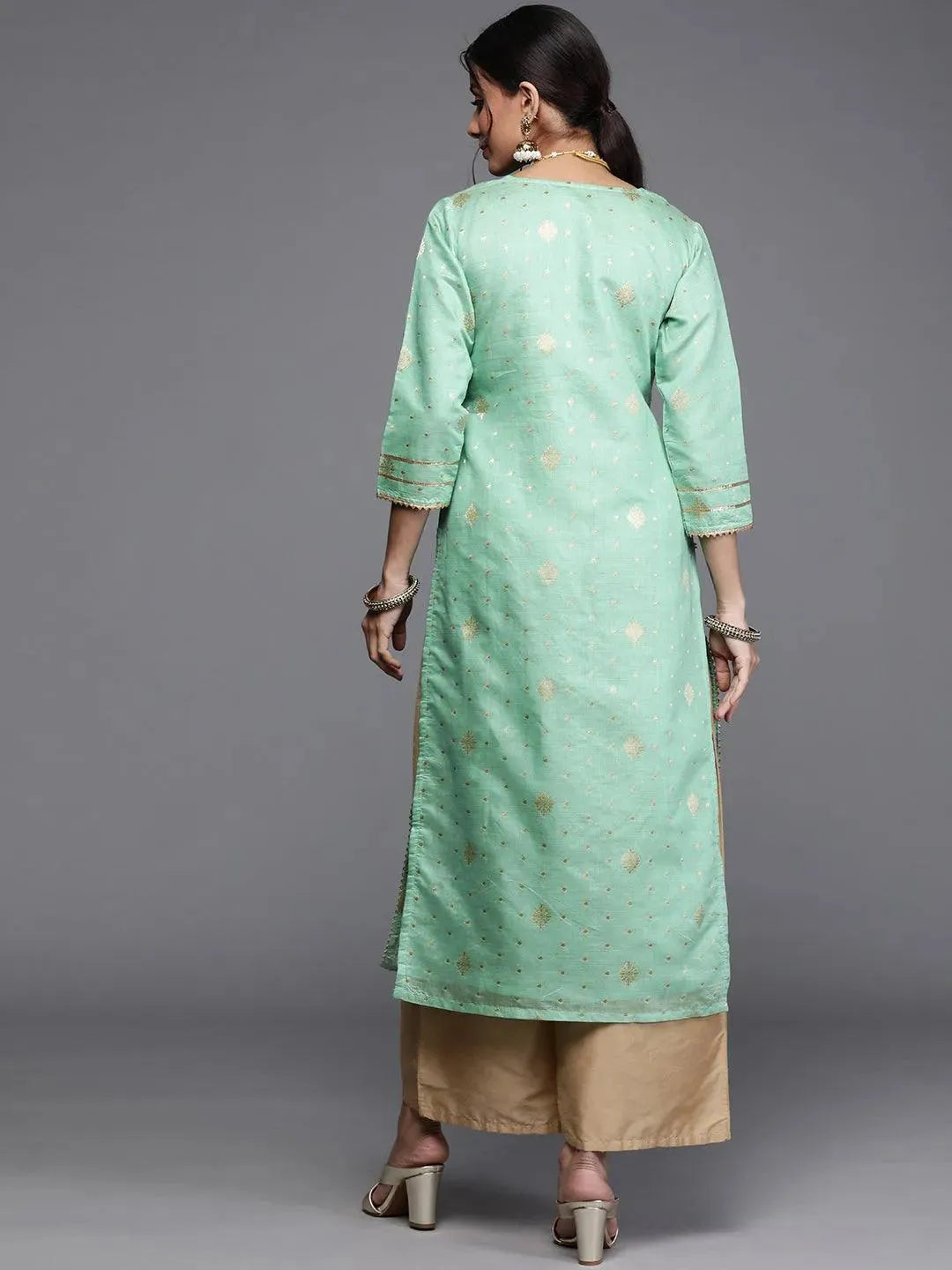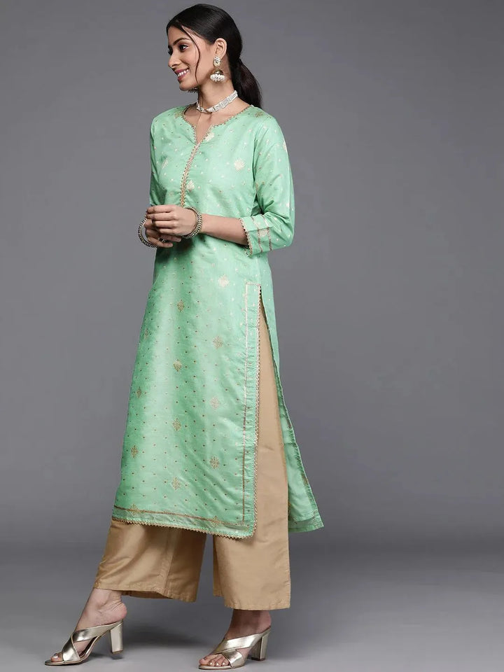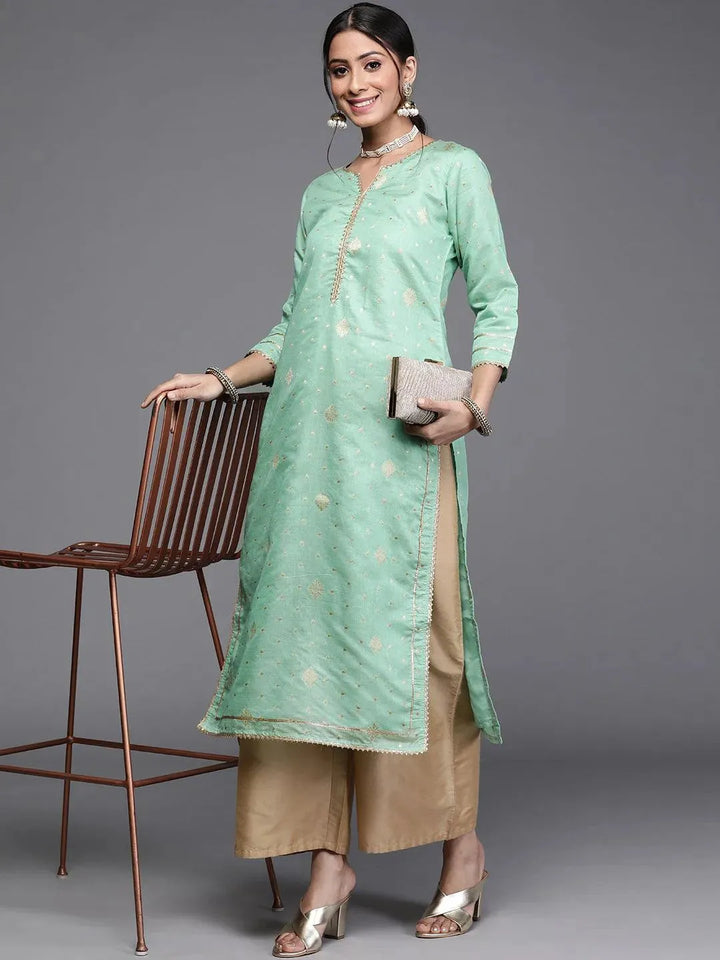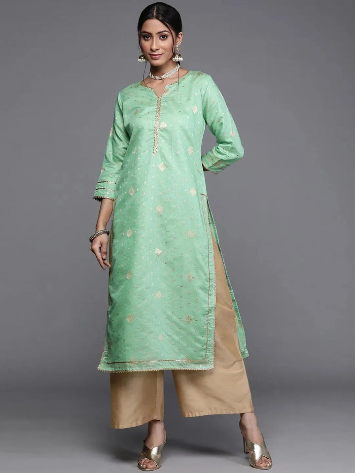 Our green and gold straight-fit kurta, crafted in Chanderi silk fabric features a notched neckline, three-quarter sleeves and a statement yoke with Gota Patti accents. This chic style is ideal for light festivities.