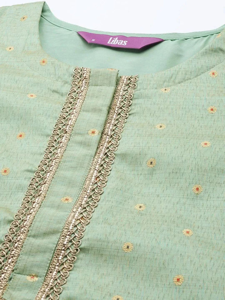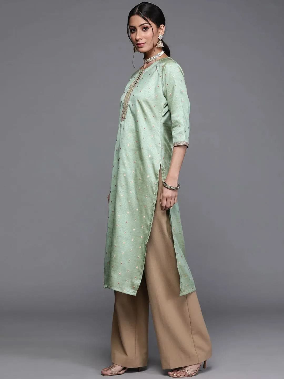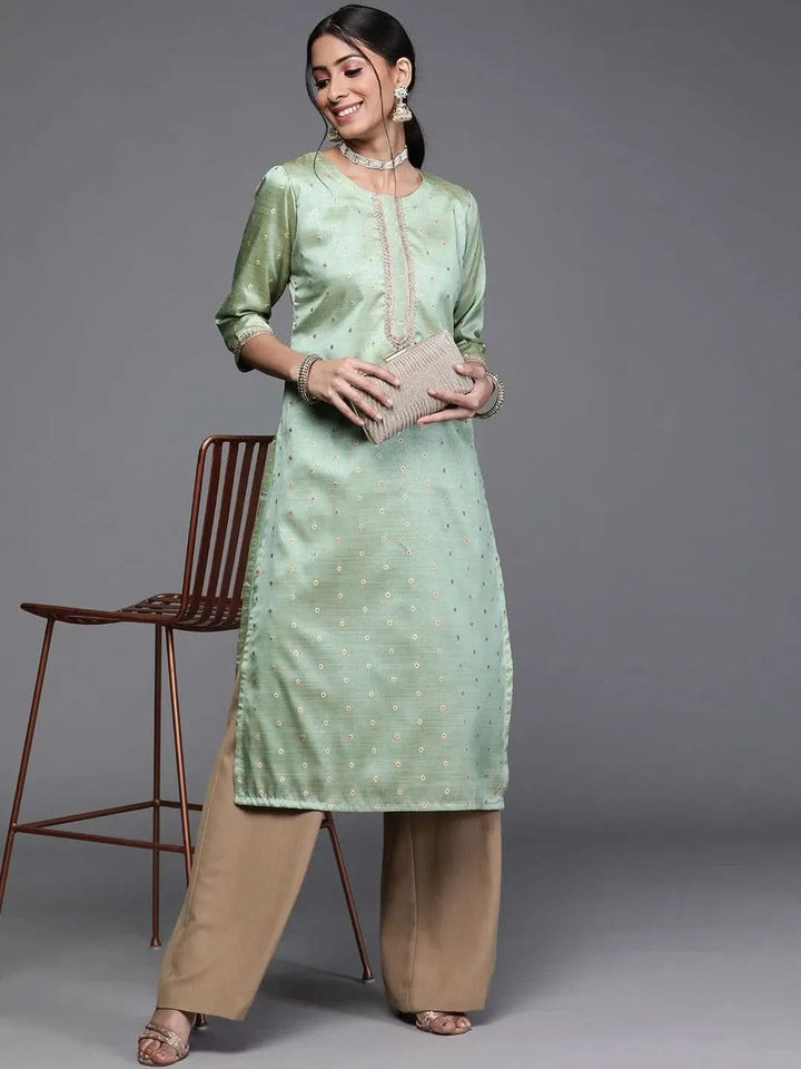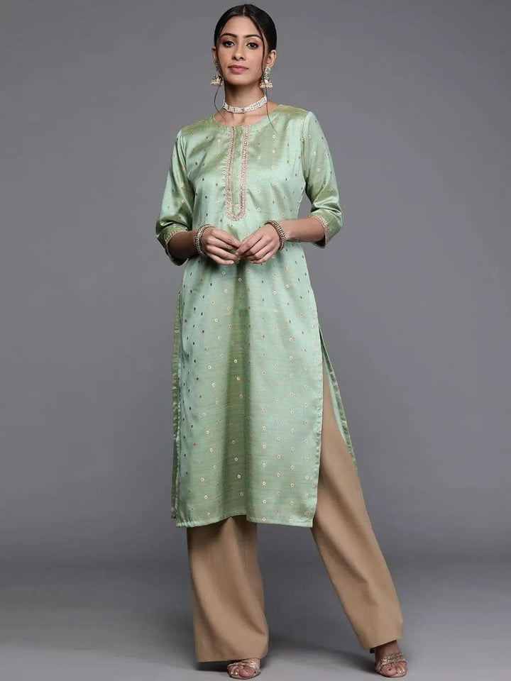 Our green woven design straight-fit kurta, crafted in sumptuous Chanderi silk fabric features a round neckline, three-quarter sleeves, and a statement yoke. Adorned with delicate Gota Patti accents, this graceful style is ideal for light festivities.