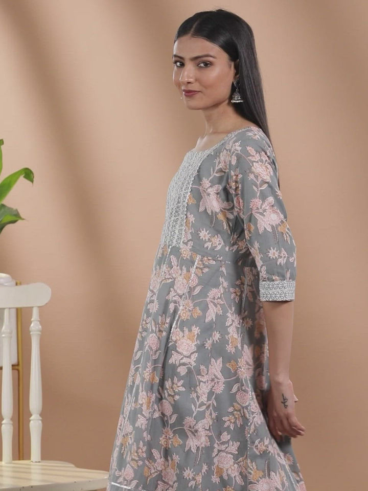 Our grey Anarkali cotton kurta features a floral print, a round neckline, a statement yoke design, and three-quarter sleeves. Adorned with Gota Patti details, this refreshing style is ideal for work and beyond.