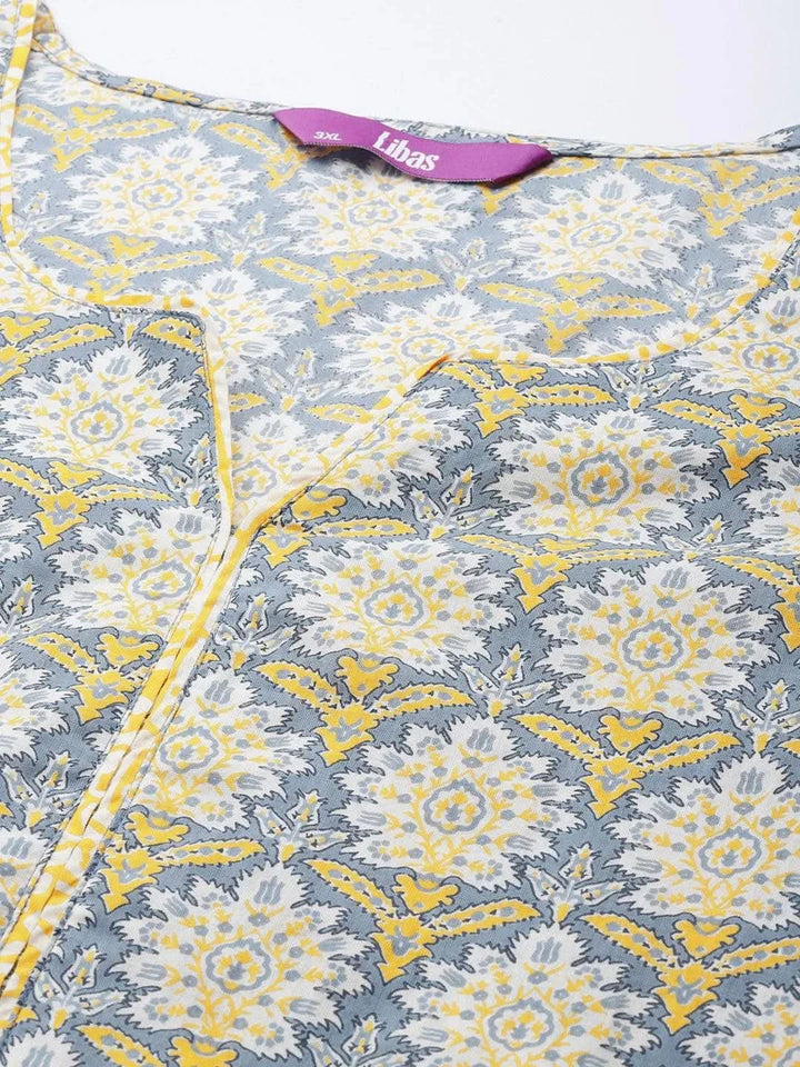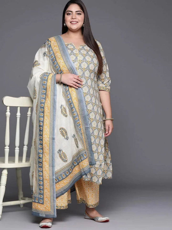 Plus Size Grey Printed Cotton Straight Kurta With Palazzos & Dupatta