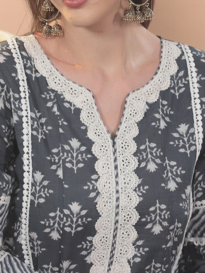 Our 3-piece grey cotton suit set highlighted by a floral print features an A-line kurta with a notched neckline, three-quarter sleeves, straight pants with a partially elasticated waistband, and a dupatta in chevron print with tassels. Adorned with delicate lace-trim accents, this style is perfect for work and beyond.