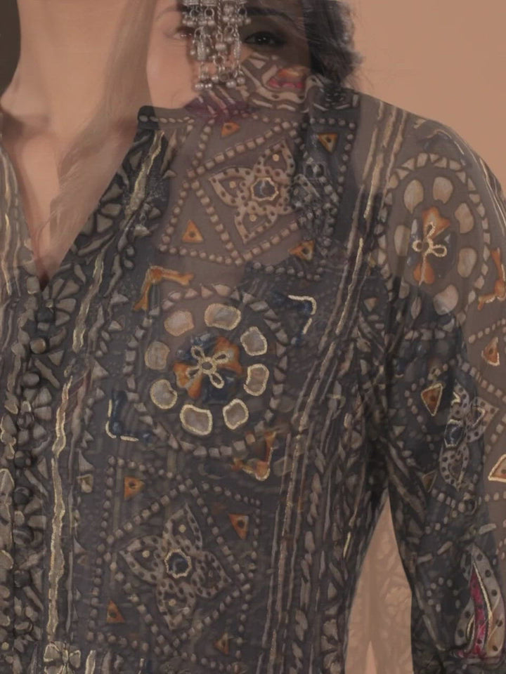 Our grey printed silk blend A-line maxi dress, elevated with a mandarin collar, three-quarter sleeves, and a flared hemline, is perfect for daytime festivities.