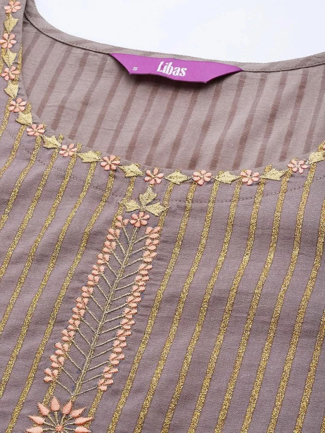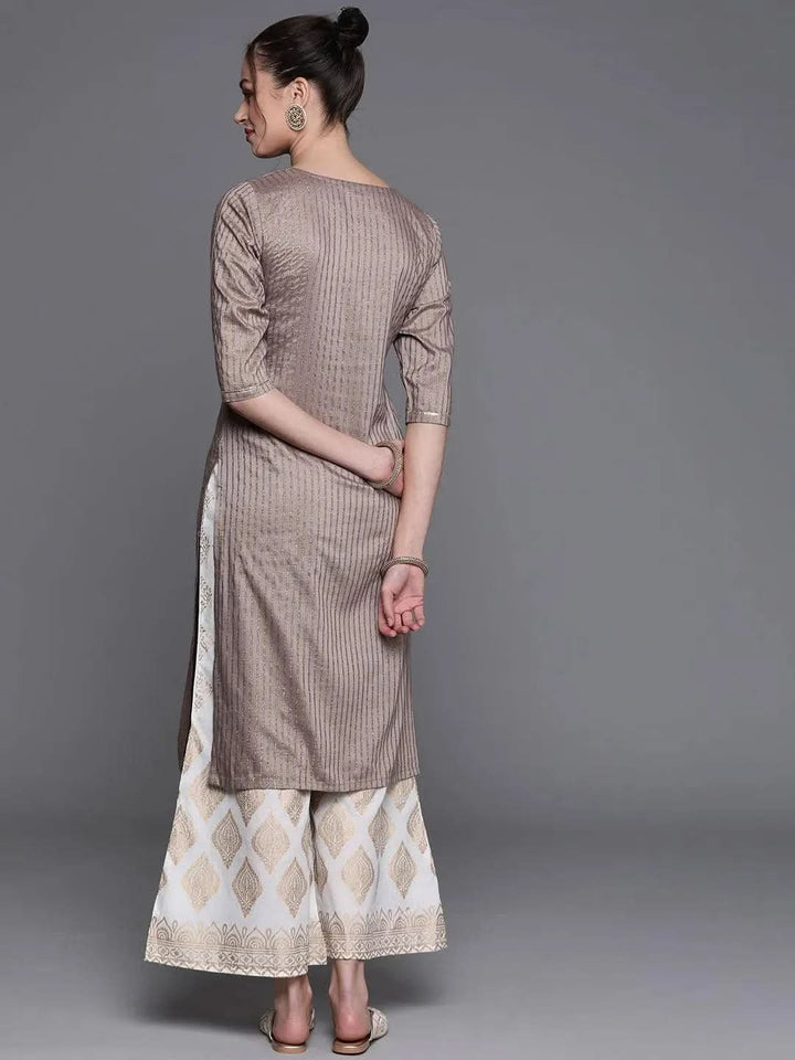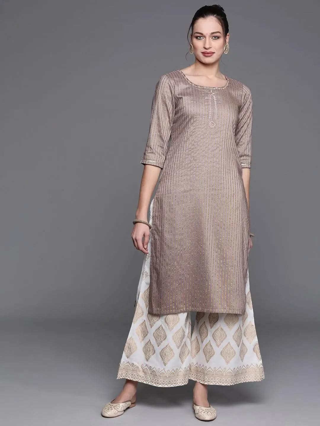 Our taupe and gold straight-fit kurta, crafted in Chanderi silk fabric features a round neckline, striped design, three-quarter sleeves and a statement yoke with embroidery. This chic style is ideal for casual outings.