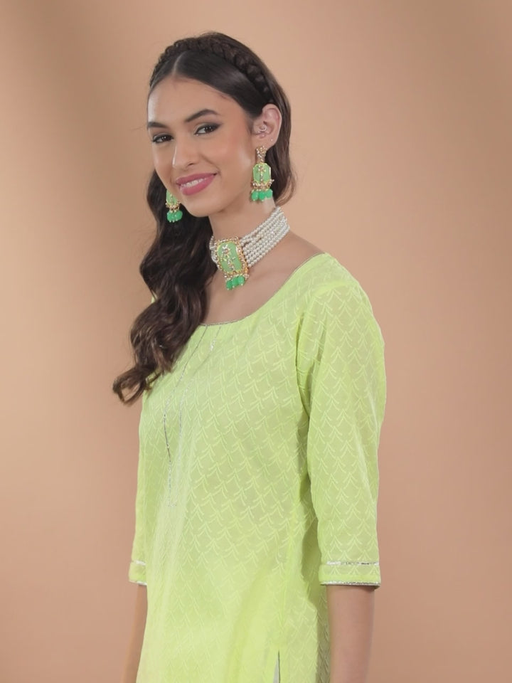 Our lime green straight-fit cotton kurta features a round neckline and three-quarter, regular sleeves. Adorned with Gota Patti accents on the yoke, this elegant style is ideal for effortless everyday wear.