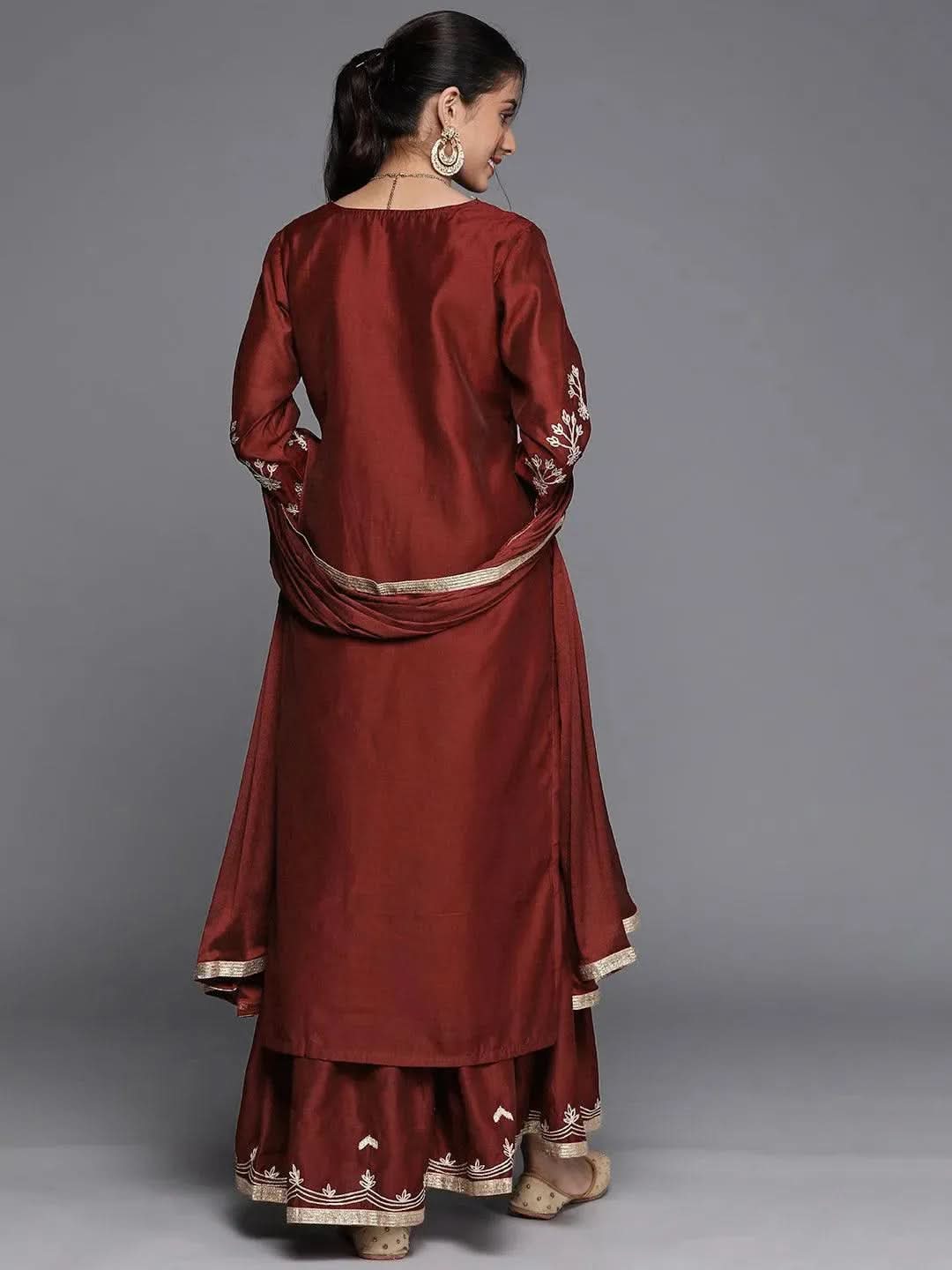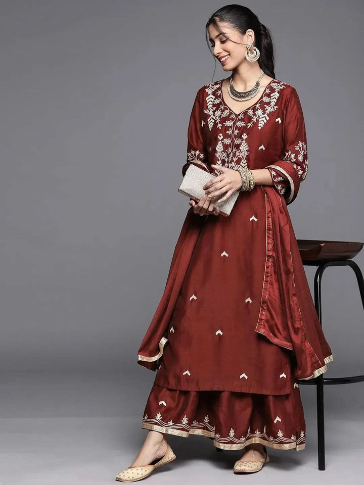 Maroon Embroidered Chanderi Silk Straight Kurta With Sharara & Dupatta