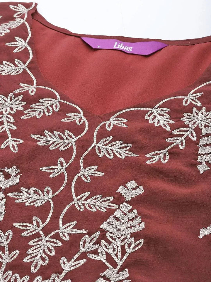 Our 3-piece maroon Chanderi silk blend suit set features a straight-fit kurta with a V-neck, intricate floral embroidery detailing, and regular three-quarter sleeves. Complemented with flared sharara pants with a partially elasticated waistband, and a dupatta in a complementing solid tone, this elegant style is ideal for evening festivities.
