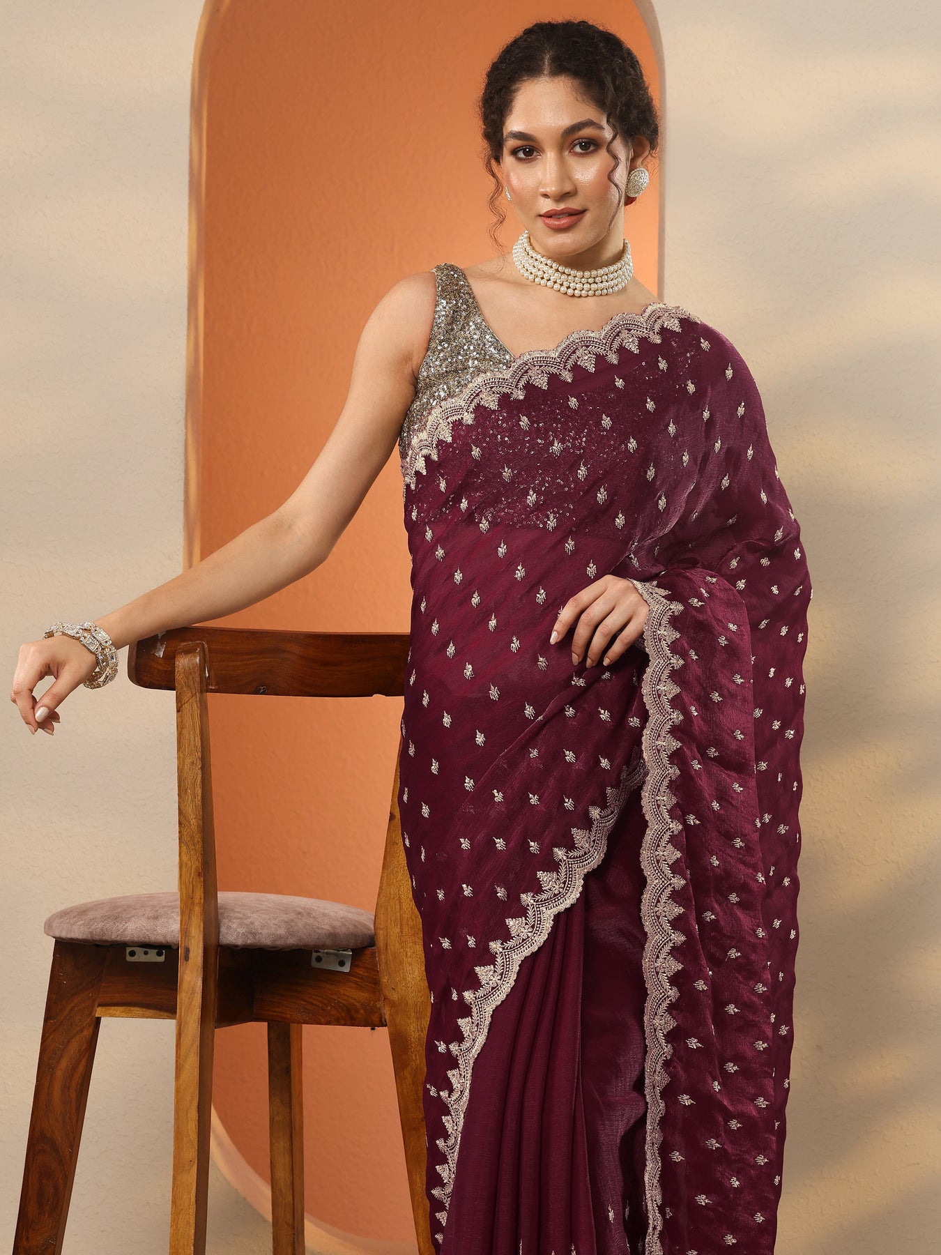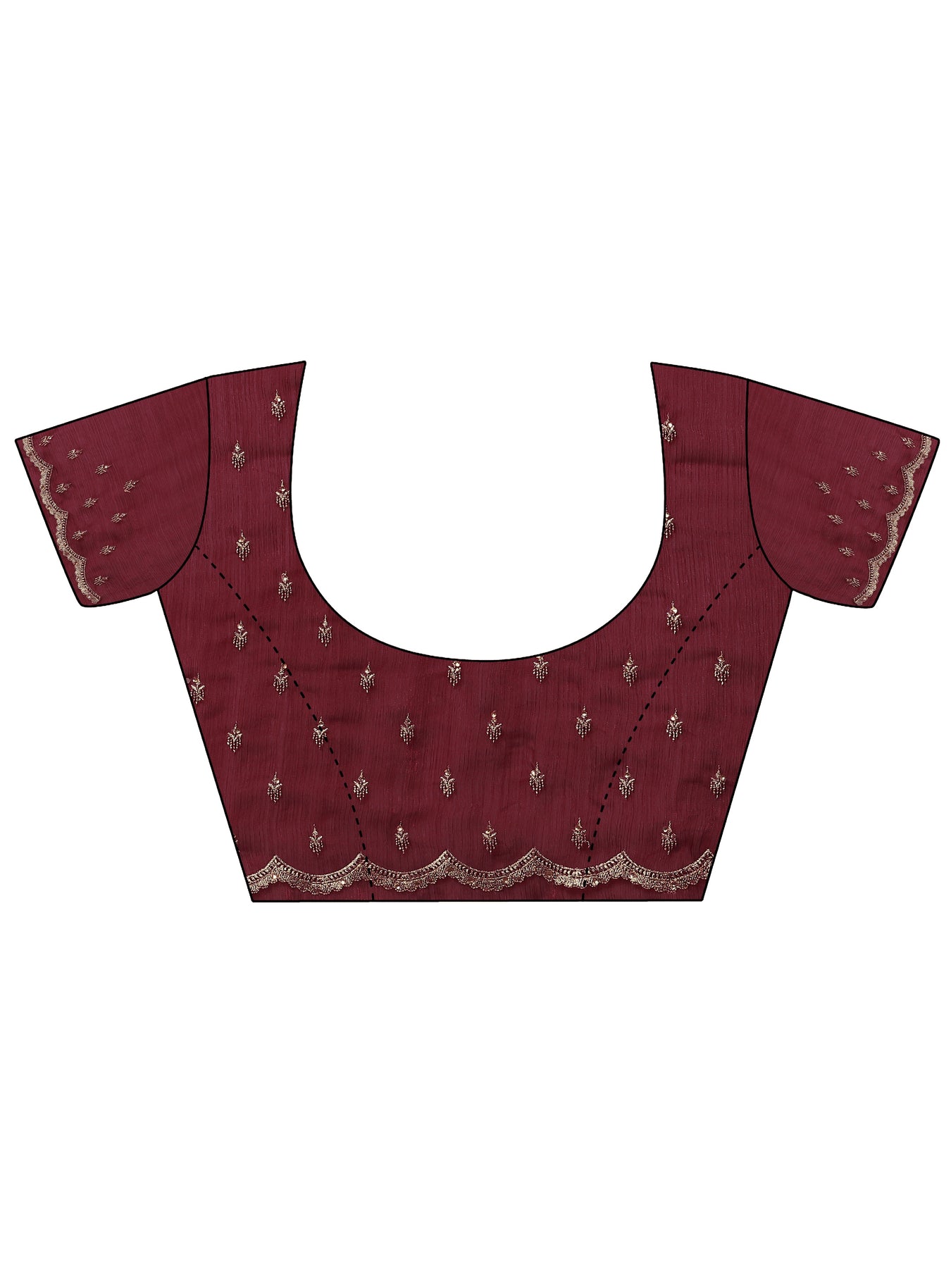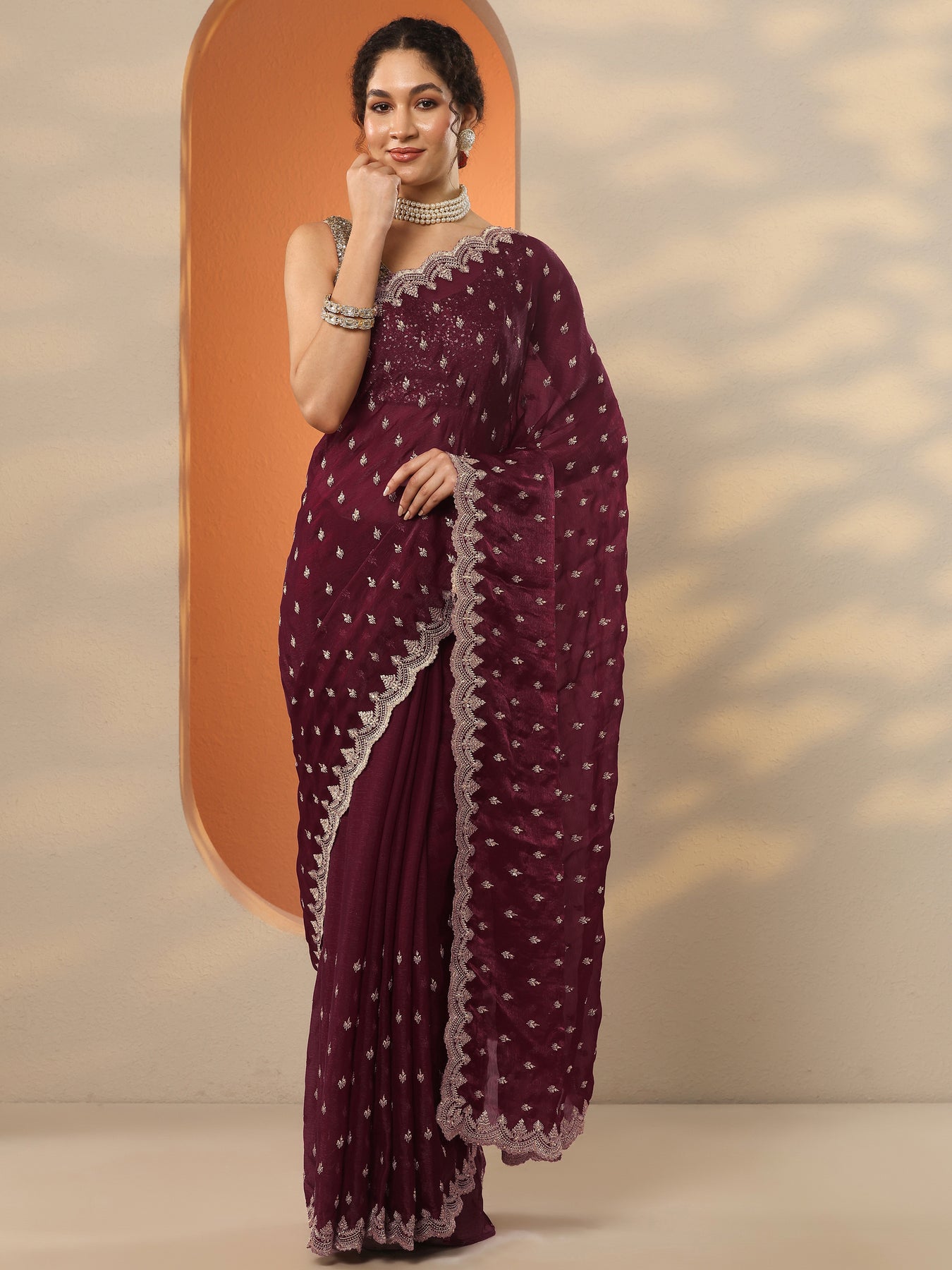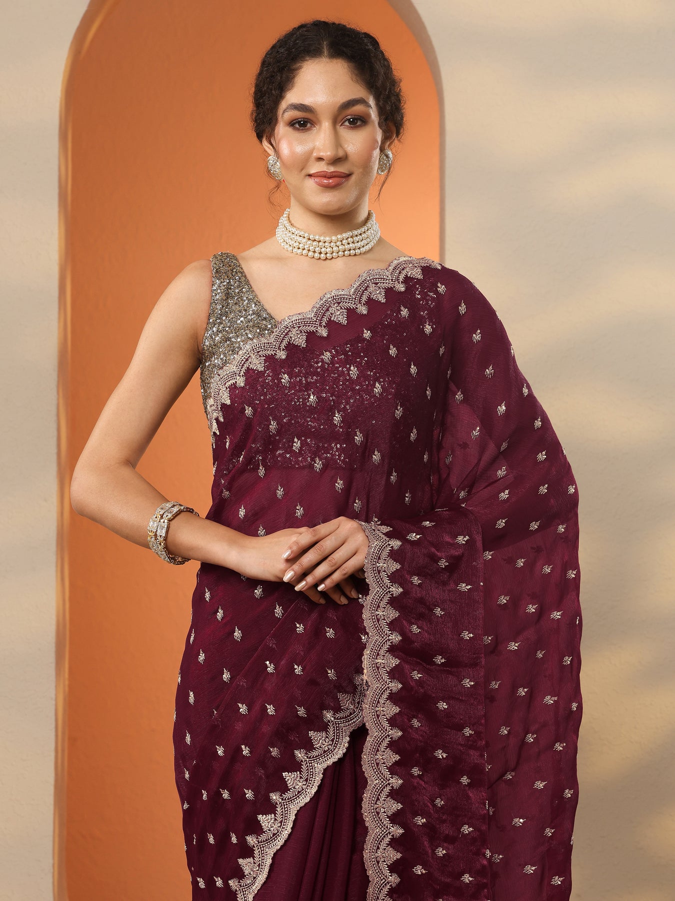 Maroon Embroidered Organza Saree With Unstitched Blouse Piece