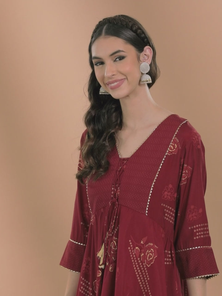 Our maroon Anarkali viscose rayon kurta features a floral print, V-neck, tie-up neck design, and three-quarter regular sleeves. This refreshing style is ideal for work and beyond.