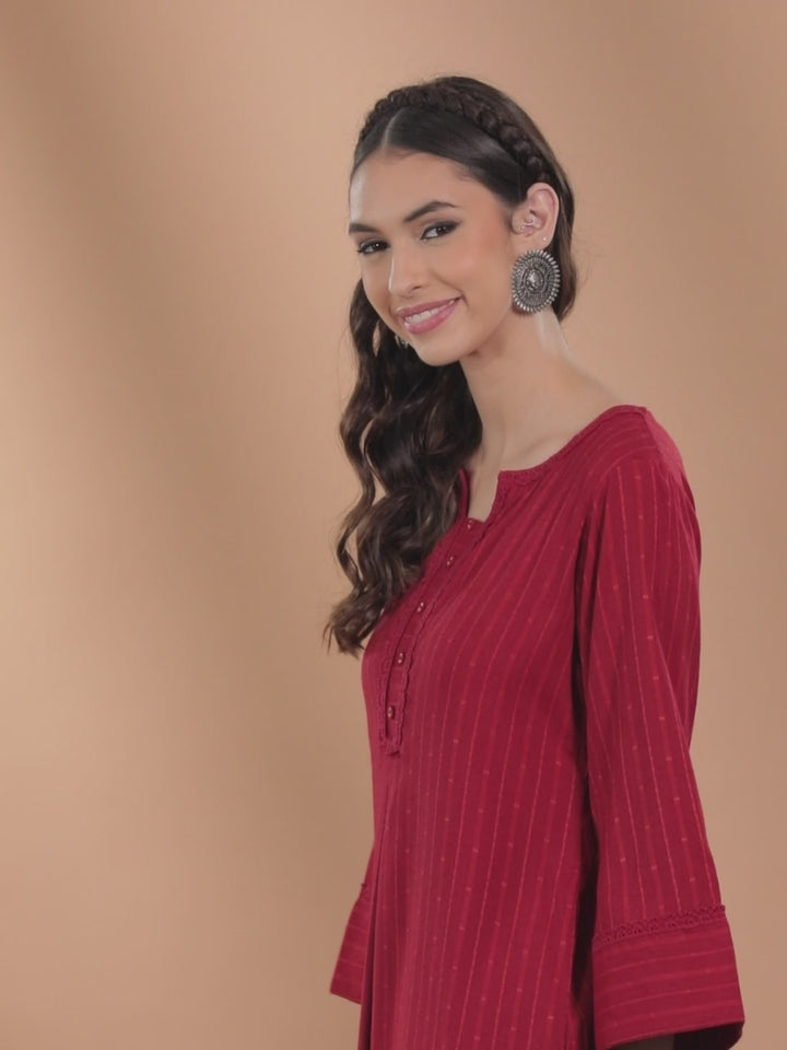 Our maroon-striped A-line viscose rayon kurta features a notched neckline and three-quarter flared sleeves, flared hemline and roomy pockets. This style is perfect for daytime festivities.
