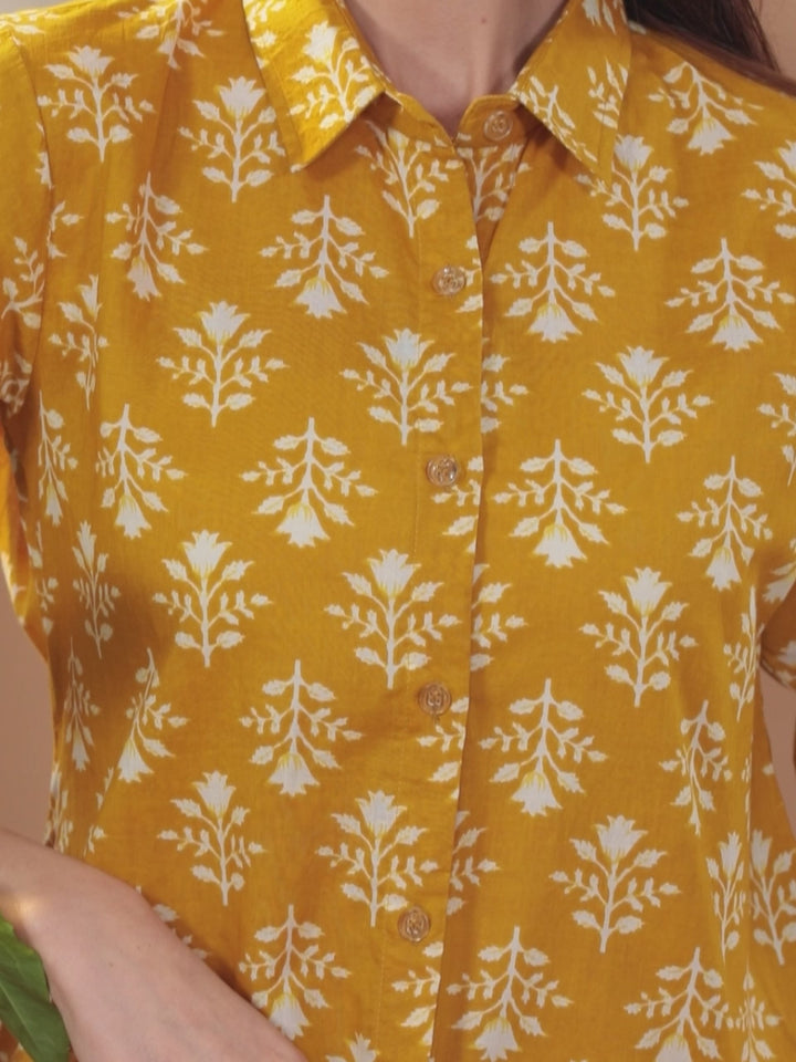 Our 2-piece mustard cotton loungewear set features a floral print kurti with a shirt collar and three-quarter sleeves. Complemented with a straight slip-on pyjama pants with roomy pockets. for a comfortable sleep. Ideal for lounging or casual outings.