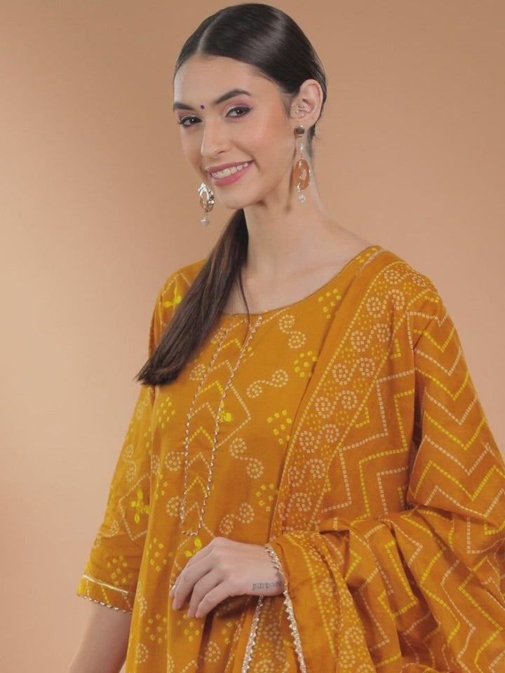 Our 3-piece mustard printed cotton suit set highlighted with a Bandhani print features an A-line kurta with a round neckline, straight pants with a partially elasticated waistband and roomy pockets, and a dupatta in a complementing print. Adorned with delicate Gota Patti accents, this style is perfect for light festivities.