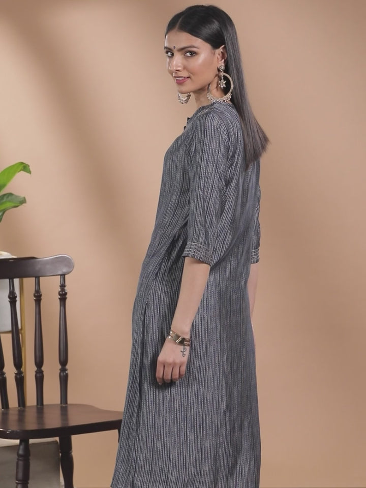 Our navy blue Chanderi silk straight-fit striped kurta features a round neck, handmade fabric buttons, Gota Patti accents and three-quarter sleeves. Complemented with roomy pockets, this style is perfect for daytime festivities.