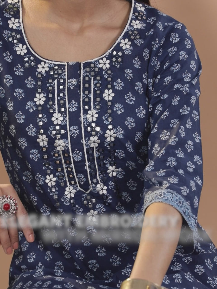 Our navy blue straight-fit kurta features floral motifs print, a round neck, and three-quarter regular sleeves. Adorned with mirror work detail, this style is ideal for daytime festivities.