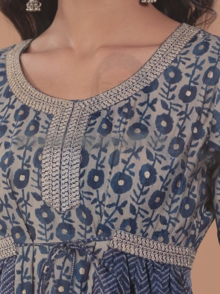 Our navy and blue and grey silk blend A-line dress features ethnic motifs print, a round neckline, statement sleeves, and a midi-length style in a flared hem. Adorned with dori details, this elegant style is ideal for elevated everyday wear.