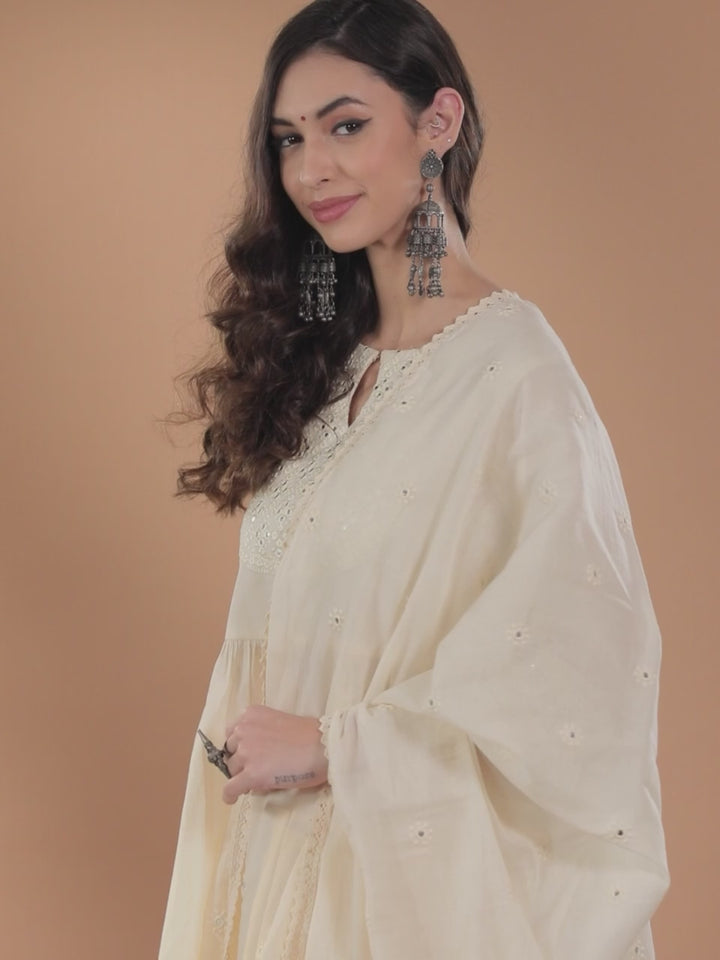 Off-White Yoke Design Cotton Anarkali Kurta With Palazzos & Dupatta