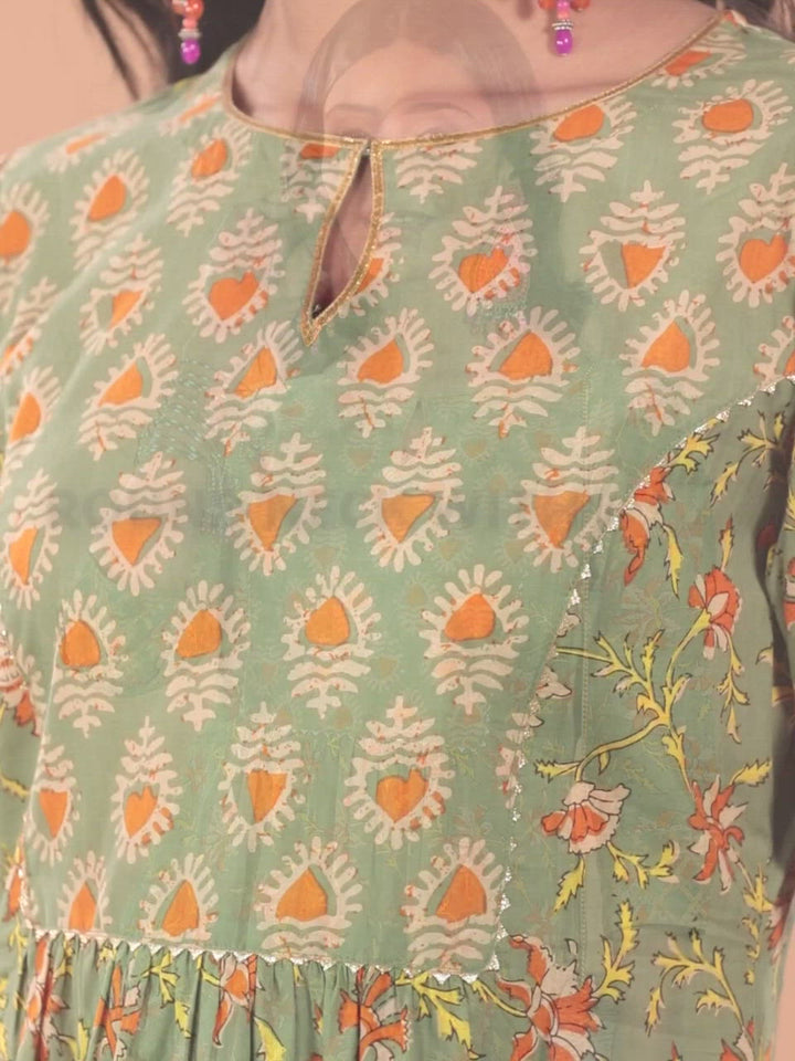 Our olive green and orange A-line cotton dress features a floral print, a keyhole neckline, three-quarter flared sleeves, and a midi-length style in a flared hem. Adorned with Gota Patti details, this elegant style is perfect for casual outings.