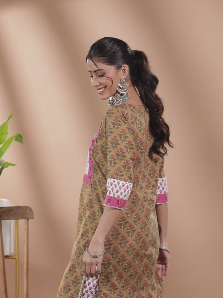 Our olive green cotton straight-fit kurta features a floral yoke design, a round neckline, and three-quarter regular sleeves. Adorned with Gota Patti details, this graceful style is ideal for daytime festivities.