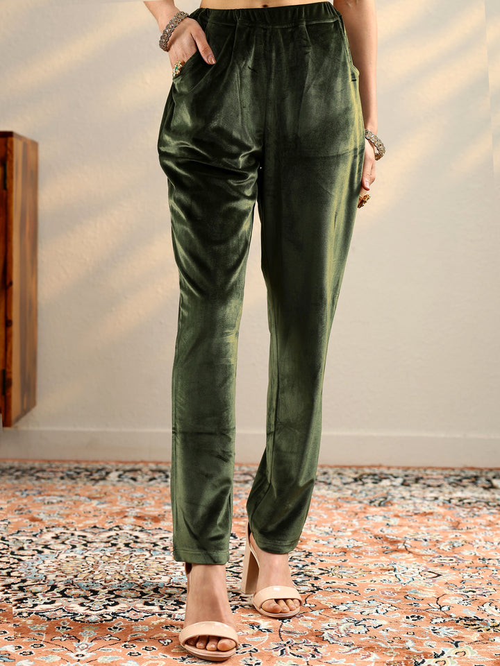Olive Yoke Design Velvet Straight Suit Set With Dupatta
