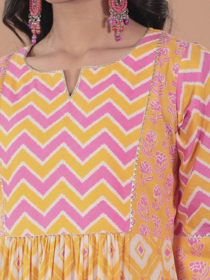 Our orange A-line cotton dress features ethnic motifs print, a notched neckline, three-quarter flared sleeves, and a maxi-length style in a flared hem. This elegant style is perfect for casual outings.