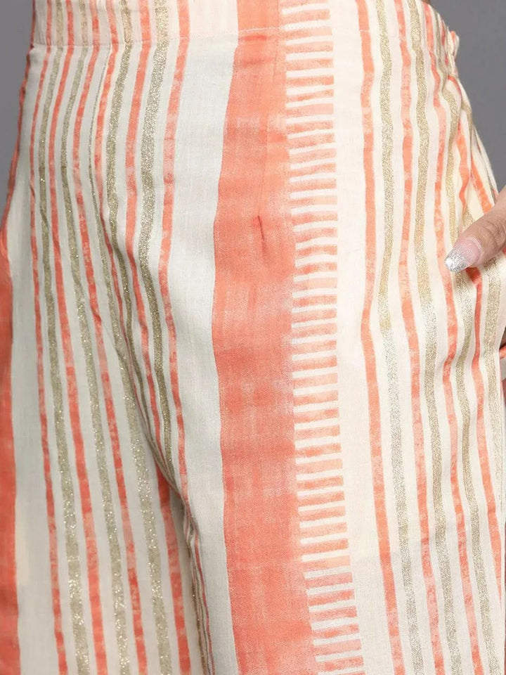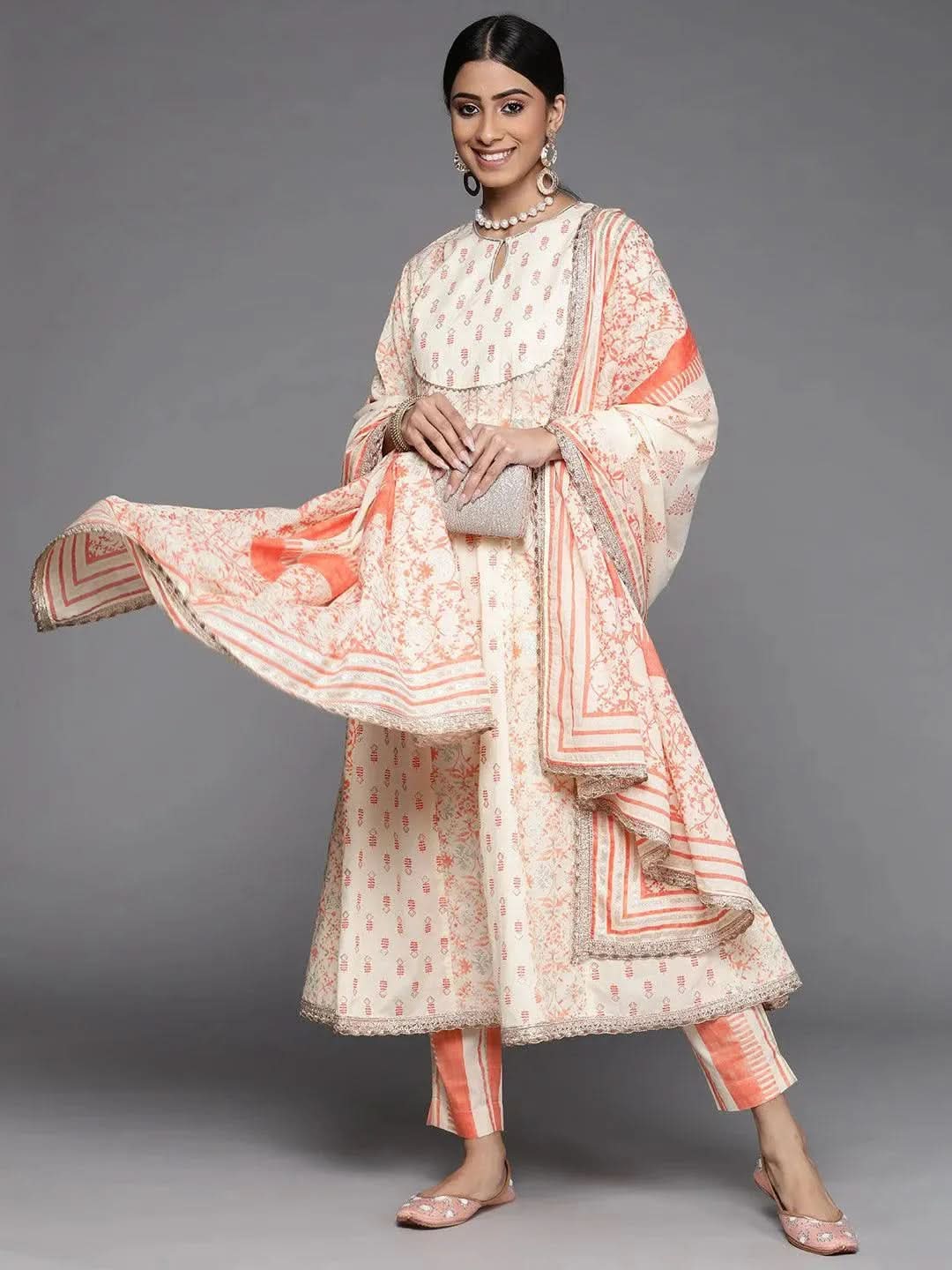 Our 3-piece orange cotton suit set features a floral print Anarkali kurta with a keyhole neckline and three-quarter sleeves. Complemented with straight pants with a partially elasticated waist, roomy pockets and a dupatta in a complementing print. Adorned with Gota Patti detailing, this refreshing style is perfect for daytime outings.