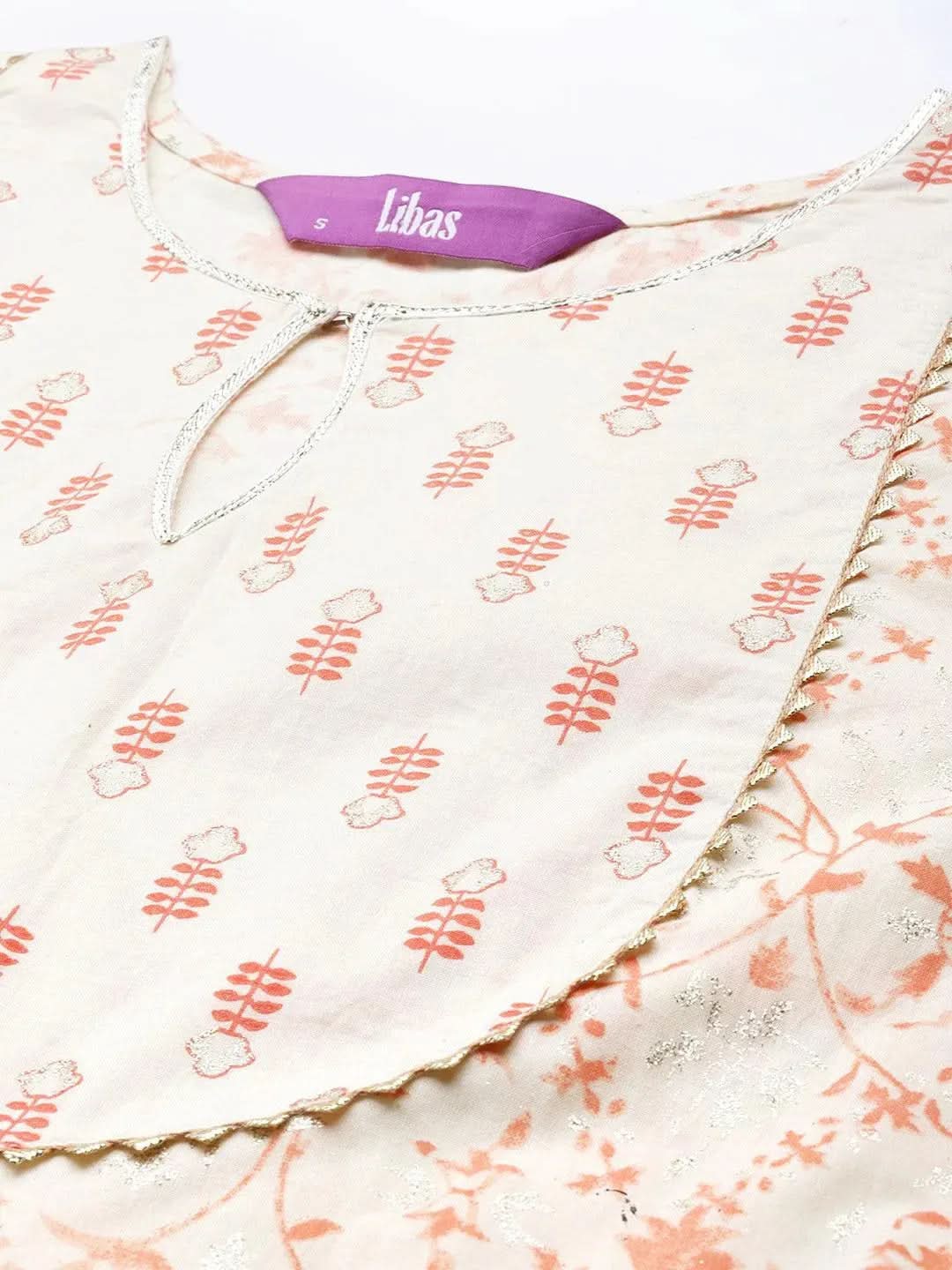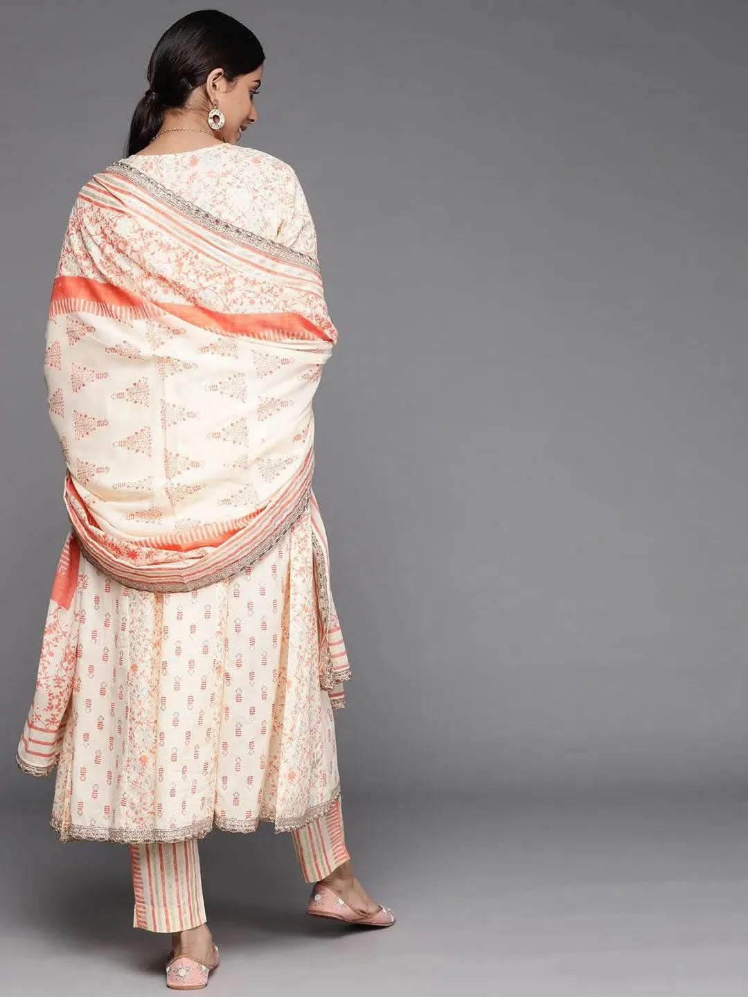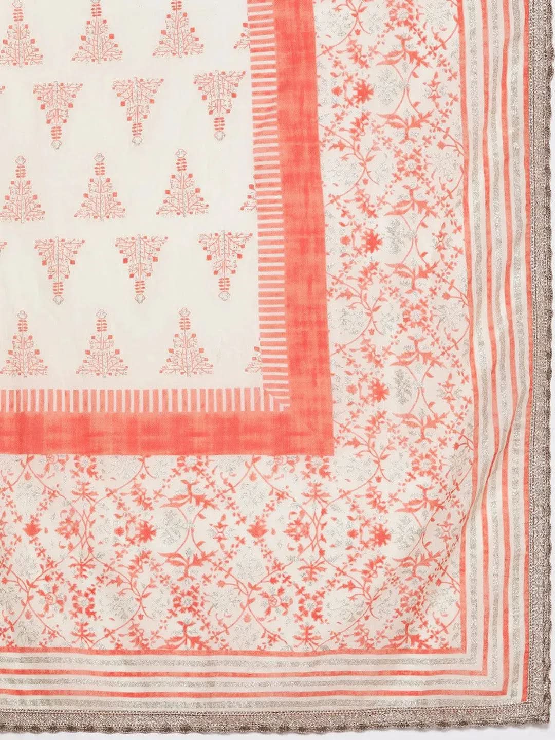 Orange Printed Cotton Anarkali Kurta With Dupatta