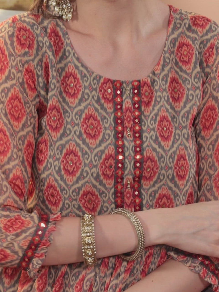 Our 3-piece orange printed georgette suit set features an A-line kurta with a round neckline and comfortable full sleeves. Complemented with flowy sharara pants and a stylish dupatta with fabric-trim and tassel detailing, this refreshing style is perfect for light festivities.