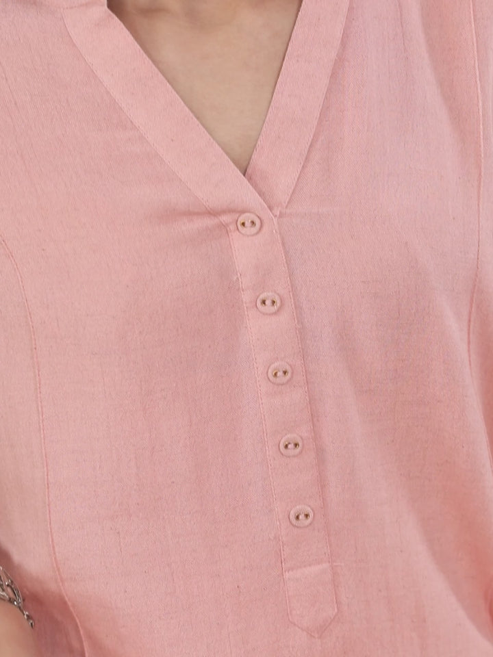 Our peach-coloured straight-fit cotton kurta features a notched neckline, three-quarter sleeves and roomy pockets. This elegant style is ideal for daytime festivities.