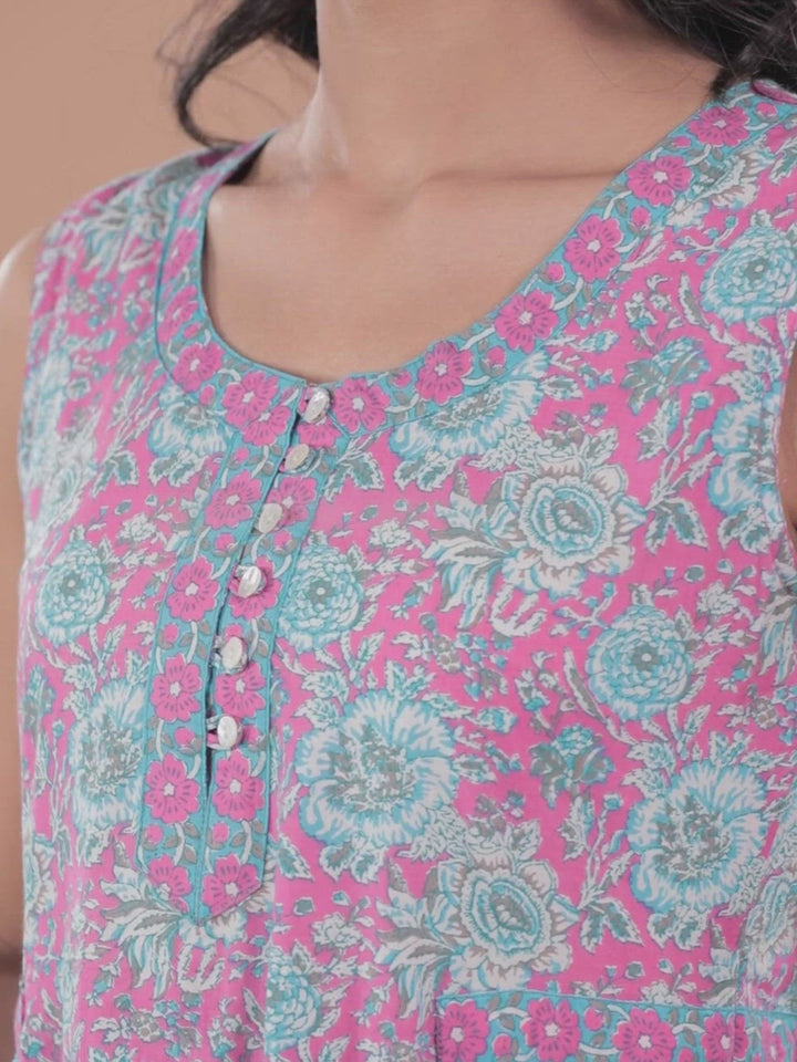 Our pink printed cotton A-line maxi dress, elevated with a round neckline, and a flared hemline, is perfect for daytime festivities.
