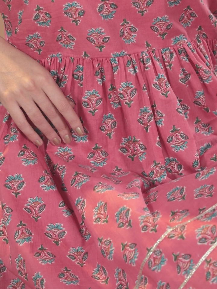 Pink Printed Cotton A-Line Kurta With Sharara