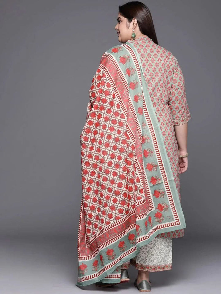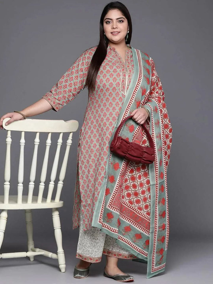 Plus Size Green Printed Cotton Straight Kurta With Palazzos & Dupatta