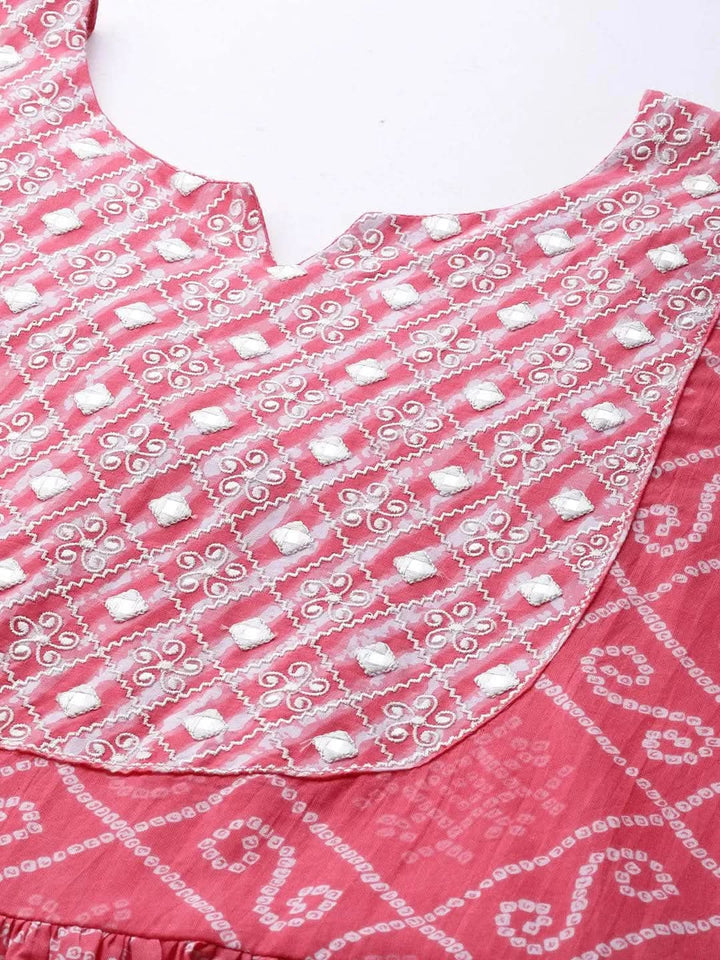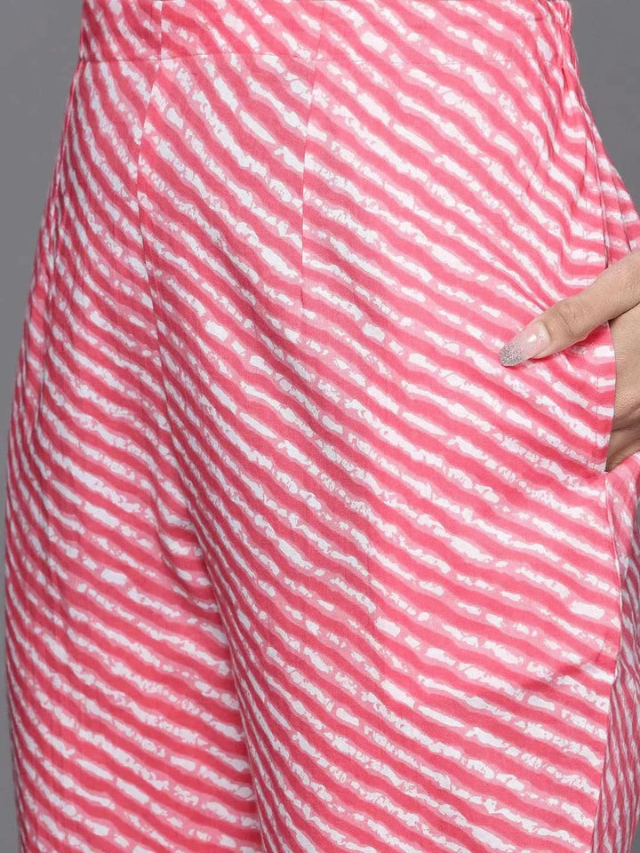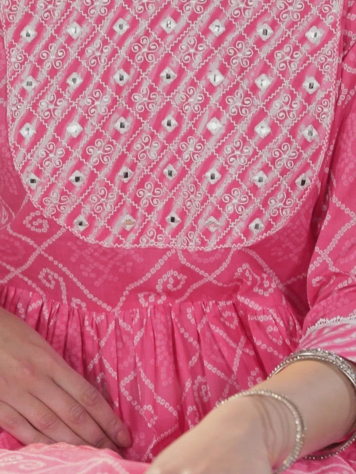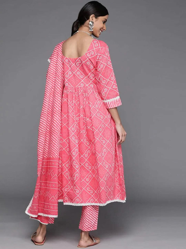 Our 3-piece pink cotton suit set highlighted by a Bandhani print features an Anarkali kurta with a notched neckline, three-quarter sleeves, palazzo pants with a partially elasticated waistband and roomy pockets, and a dupatta with contrasting Leheriya print. Adorned with a statement yoke and delicate lace-trim accents, this style is perfect for light festivities.