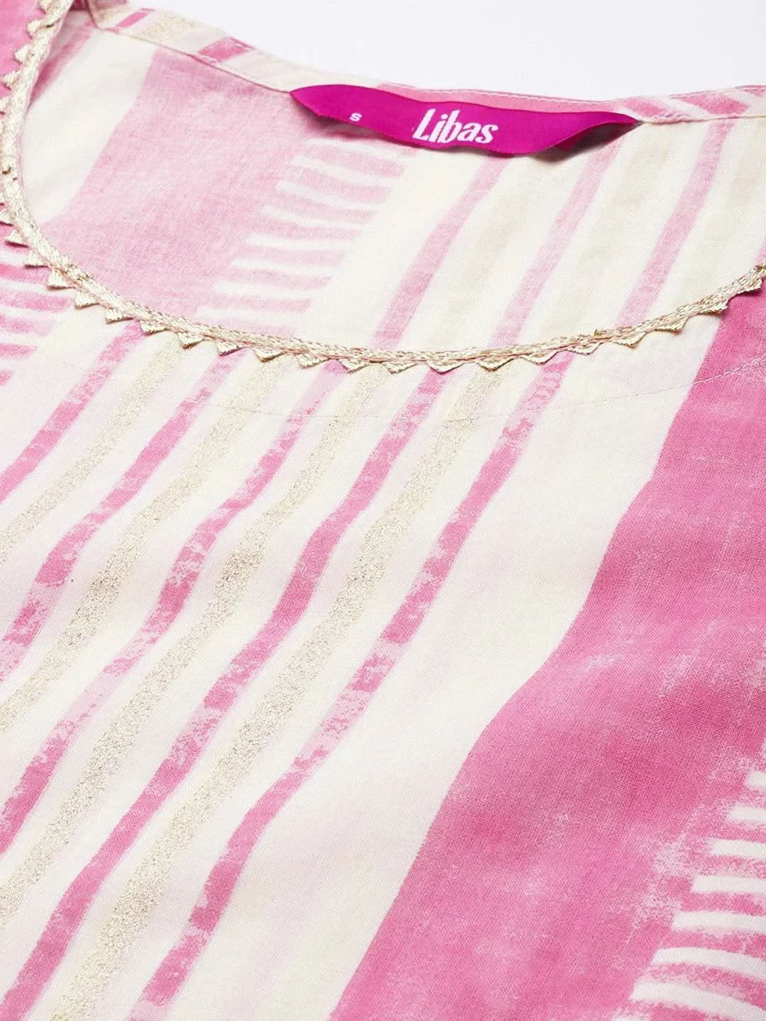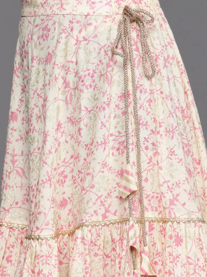 Pink Printed Cotton Straight Kurta With Skirt & Dupatta