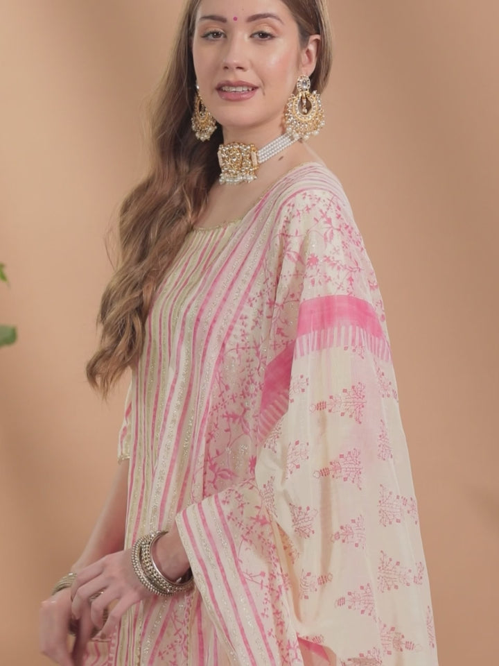 Our 3-piece cream-coloured cotton suit set features a floral print straight-fit kurta with a round neckline and three-quarter sleeves. Complemented with a stylish skirt with a partially elasticated waist, and a dupatta in a complementing print. Adorned with Gota Patti detailing, this refreshing style is perfect for daytime festivities.