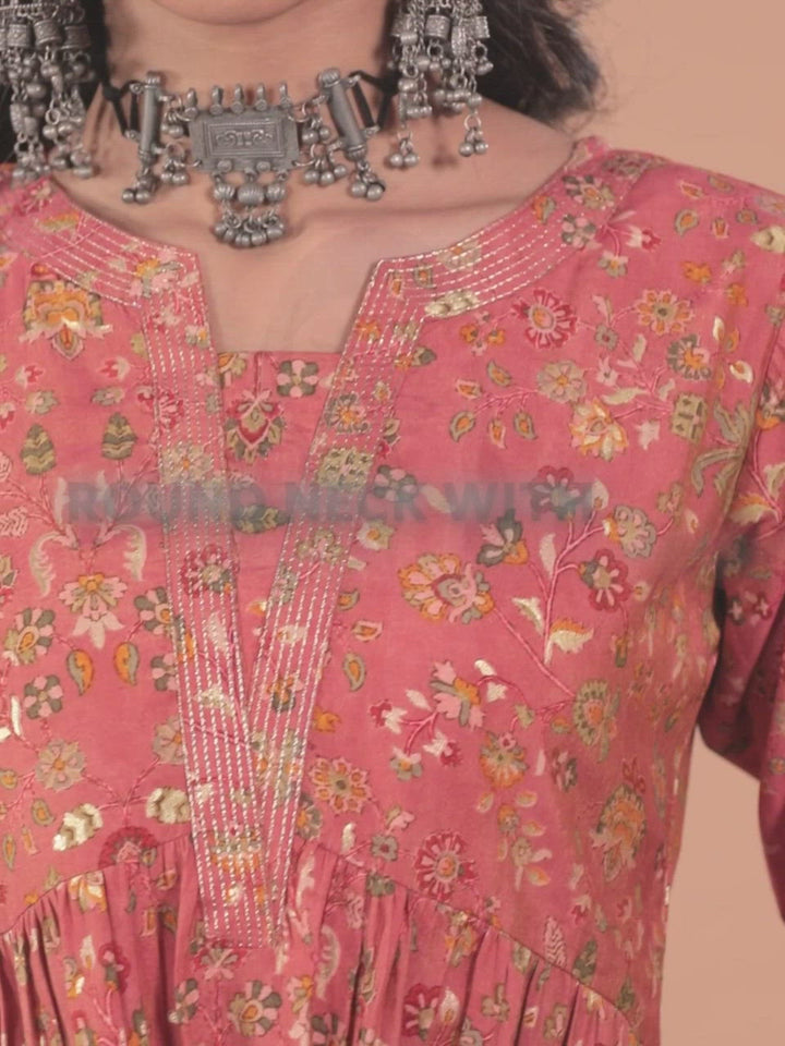 Our pink and olive silk-blend A-line printed dress features a notched neckline, three-quarter regular sleeves, and a midi-length style in a flared hem. Adorned with threadwork detailing, this elegant style is perfect for light festivities.