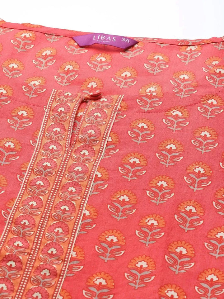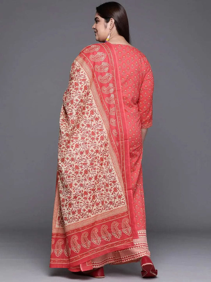 Plus Size Coral Printed Cotton Straight Kurta With Palazzos & Dupatta