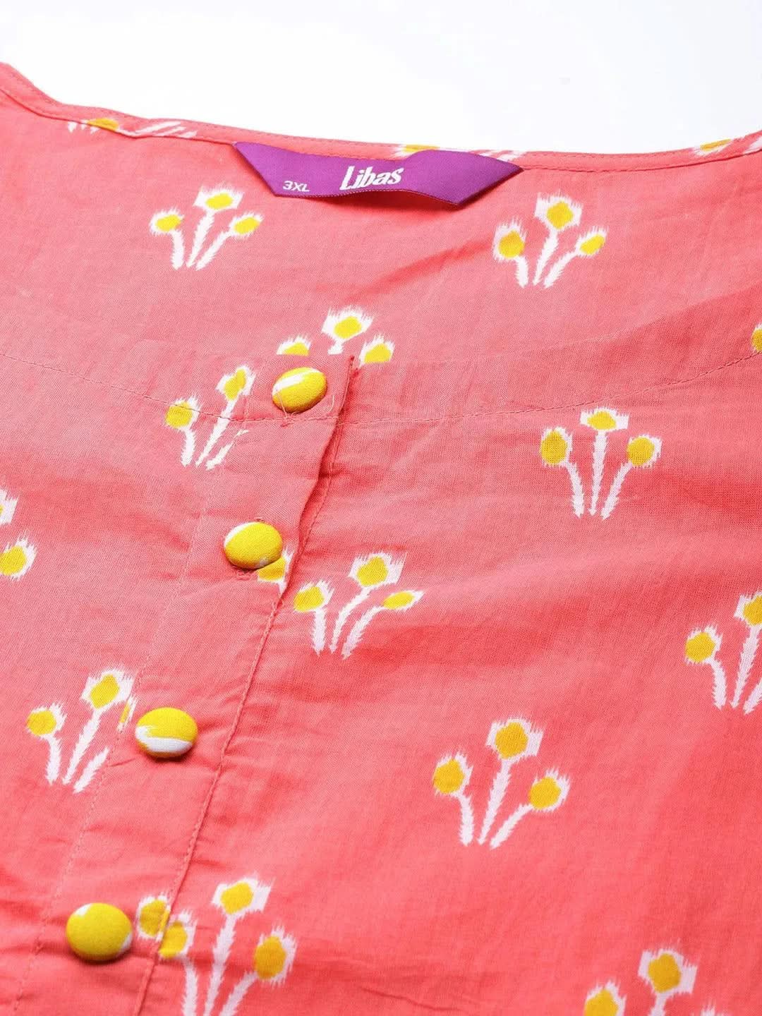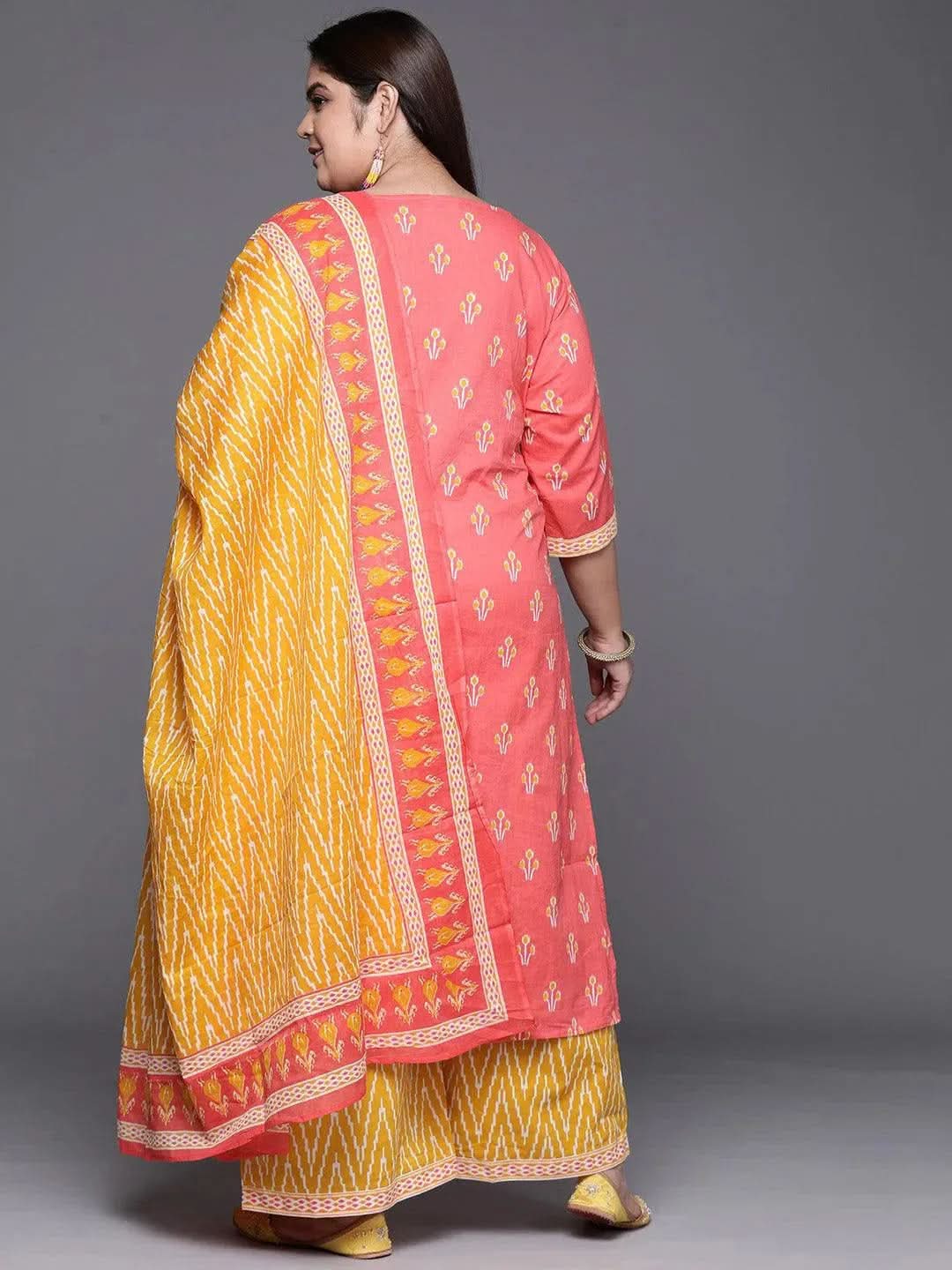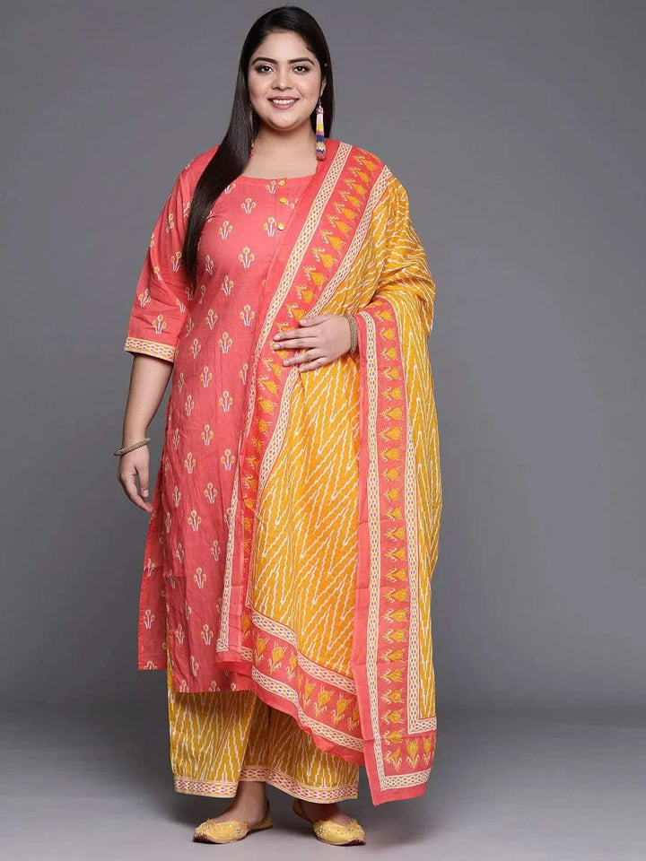 Plus Size Pink Printed Cotton Straight Kurta With Palazzos & Dupatta