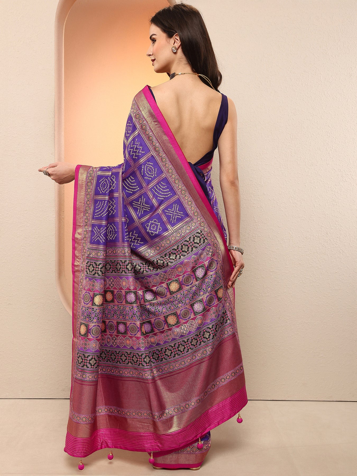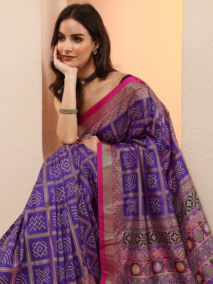 Purple Bandhani Printed Sarees With Unstitched Blouse Piece