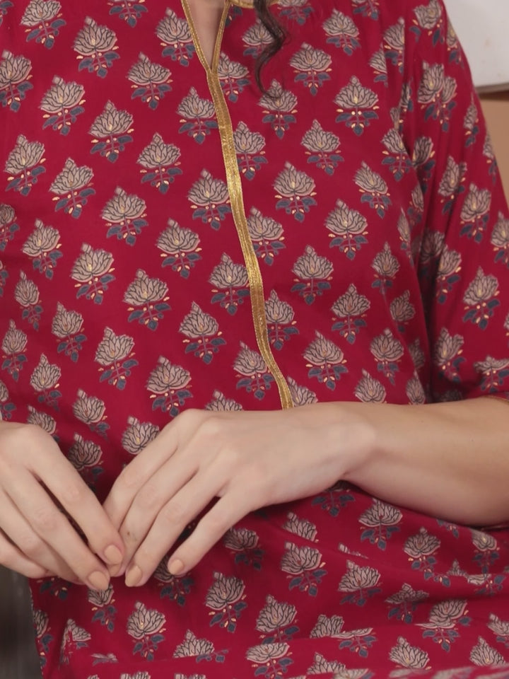Our 3-piece red silk suit set features a straight shape kurta with a notched neck, floral print, Gota Patti detailing, and regular three-quarter sleeves. Complemented with pants, a partially elasticated waistband, 2 roomy pocket, slip-on closure, and a matching dupatta, this style is perfect for light festivities.