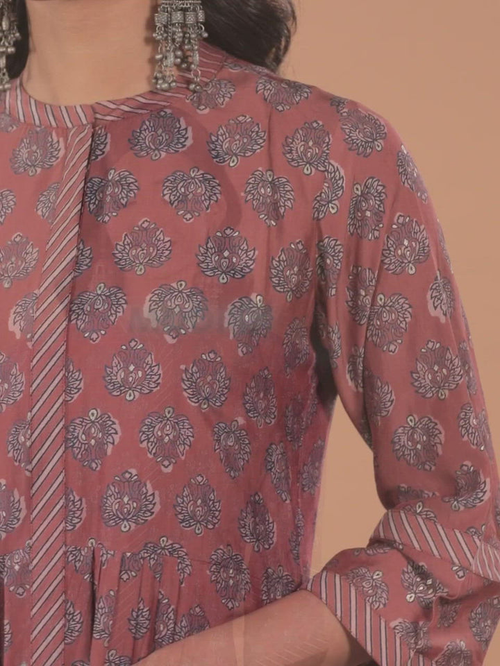 Our rust and navy blue maxi dress, crafted in rich silk, features a mandarin collar, ethnic motifs print, flared three-quarter sleeves, pleated detailing and flared hem. This chic style is ideal for work and beyond.