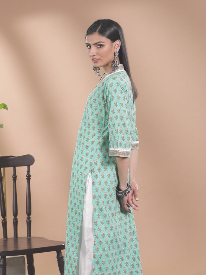 Our sea green cotton straight-fit kurta features ethnic motifs print, a V-neckline, lace detailing, and three-quarter flared sleeves. This elegant style is ideal for daytime festivities.