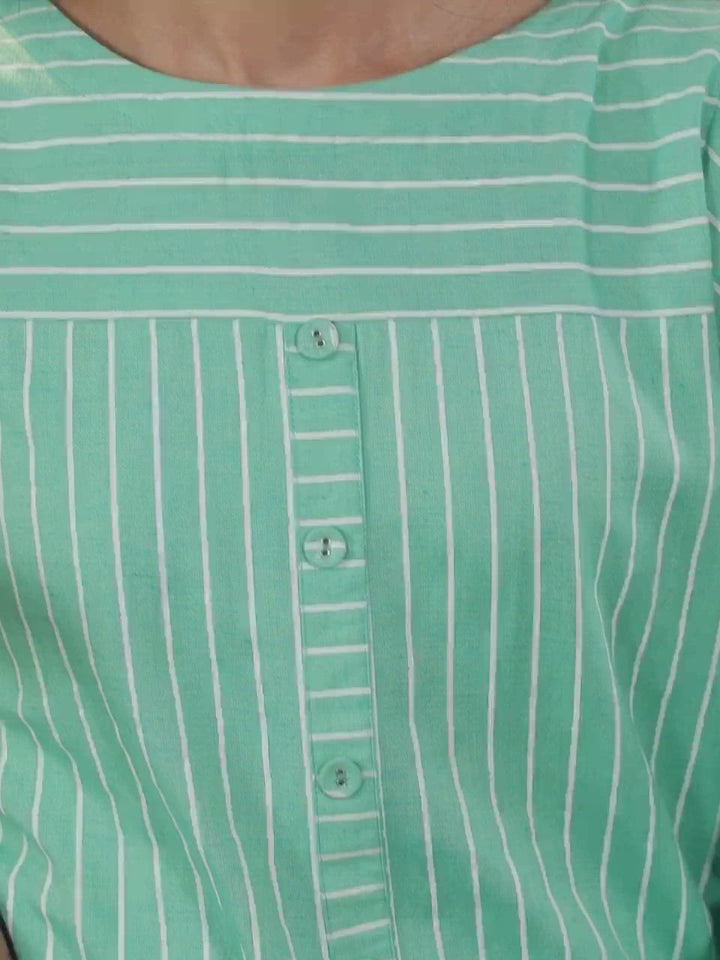 Our sea green striped straight shape cotton kurta features handmade fabric buttons, a round neckline, and three-quarter sleeves. This elegant style is perfect for daytime festivities.