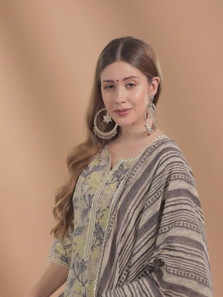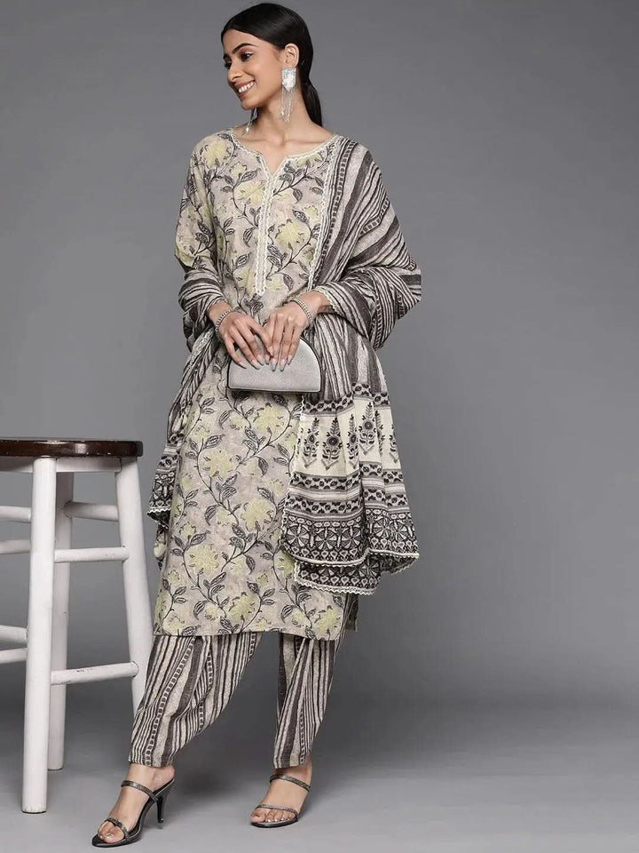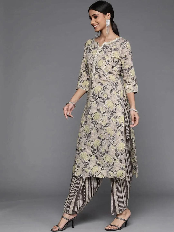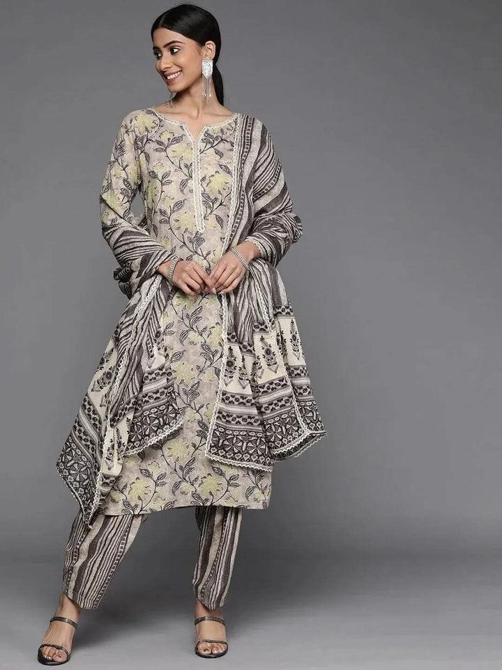 Our 3-piece taupe printed cotton suit set highlighted with a floral print features a straight-fit kurta with a notched neckline, straight pants with a partially elasticated waistband and roomy pockets, and a dupatta in a complementing print. Adorned with delicate lace trim accents, this style is perfect for light festivities.