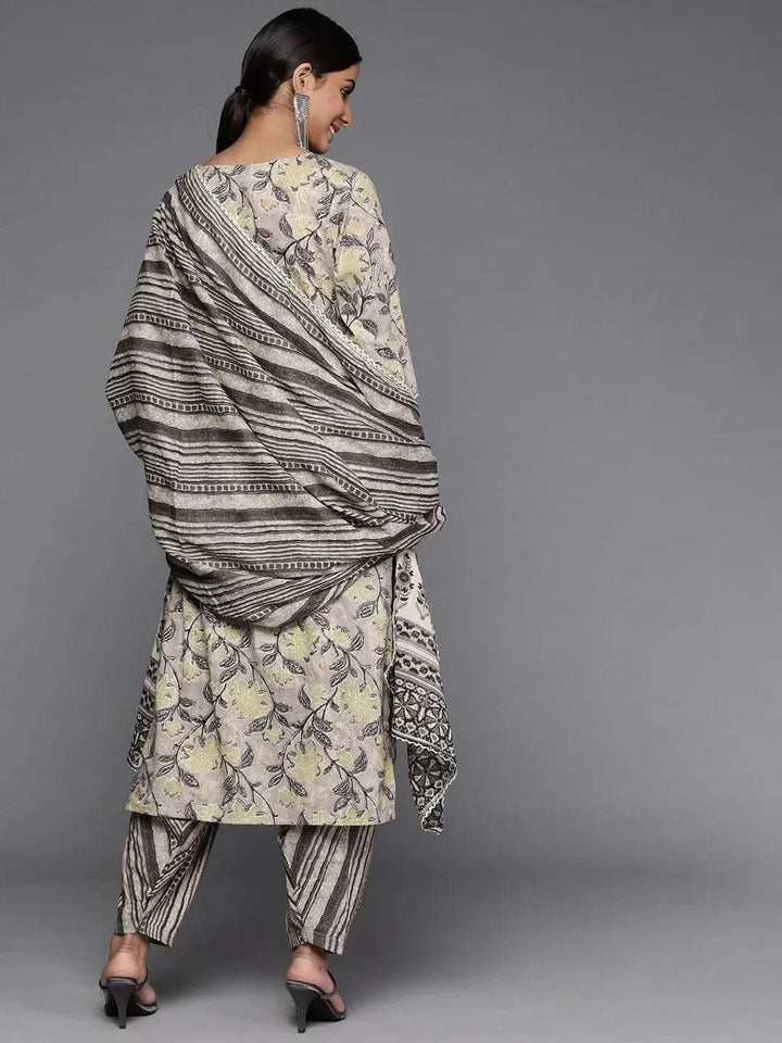 Taupe Printed Cotton Straight Kurta With Salwar & Dupatta