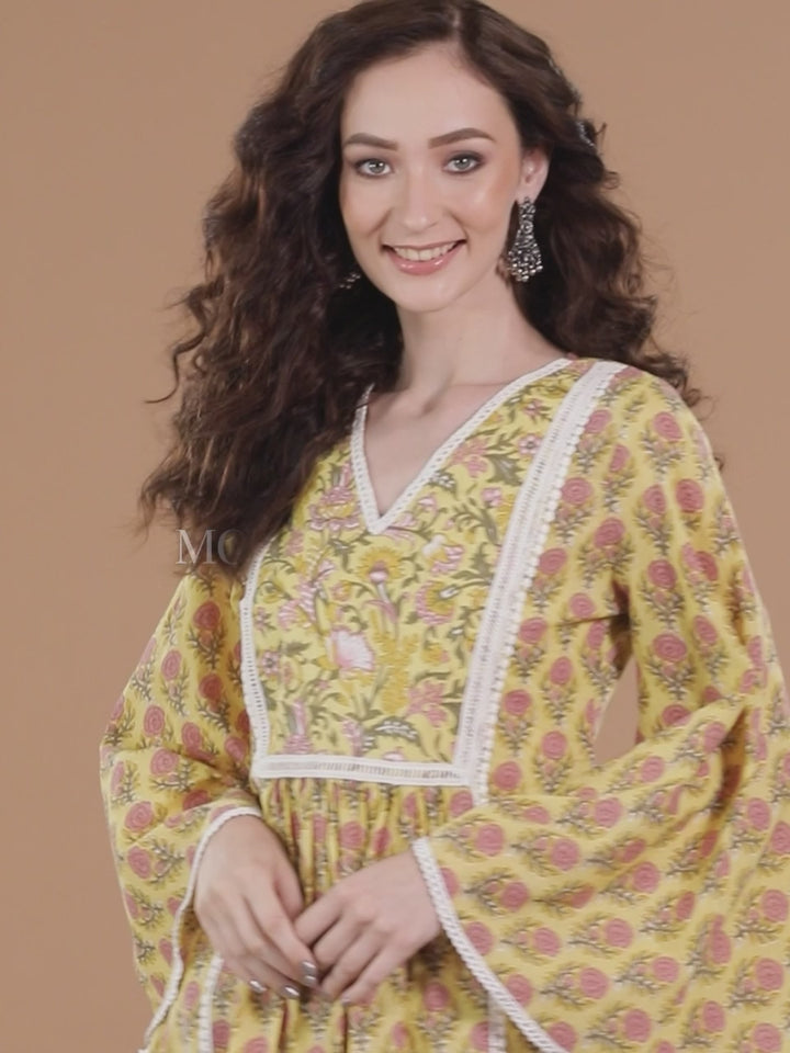 Our yellow and pink printed cotton A-line midi dress is elevated with a V-neckline, floral print, and three-quarter bell sleeves. This elegant is perfect for daytime festivities.