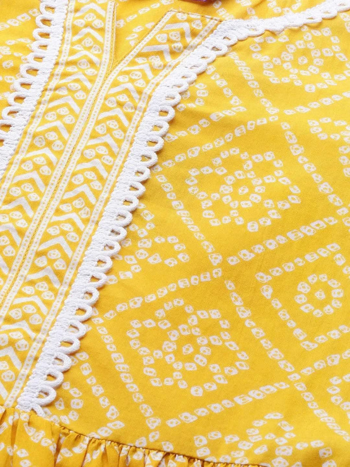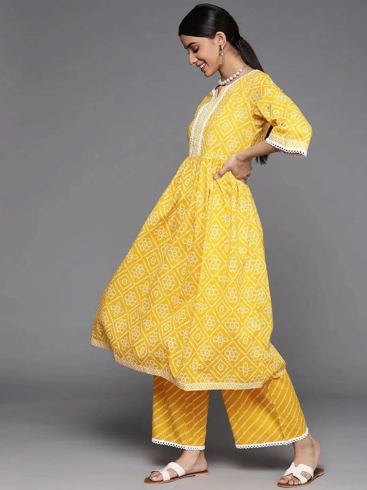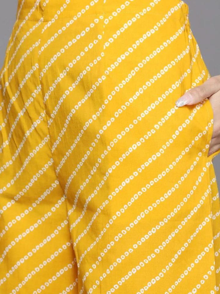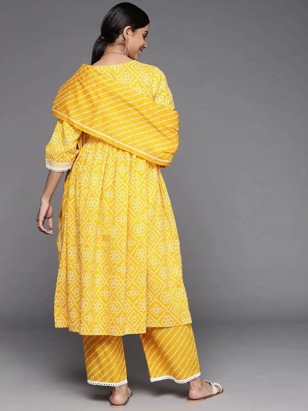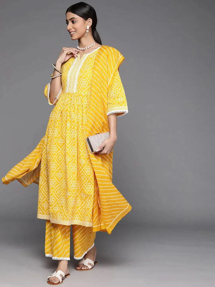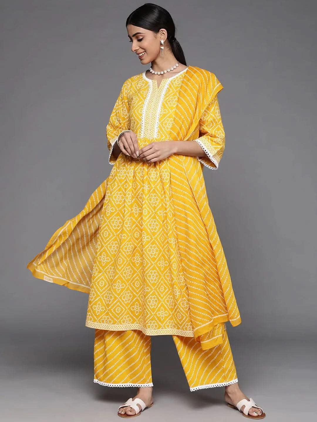 Our 3-piece yellow cotton suit set highlighted by a Bandhani print features an Anarkali kurta with a notched neckline, three-quarter sleeves, a printed palazzo with a partially elasticated waistband, and a dupatta in a complementing style. Adorned with delicate lace-trim accents, this style is perfect for elevated everyday wear.