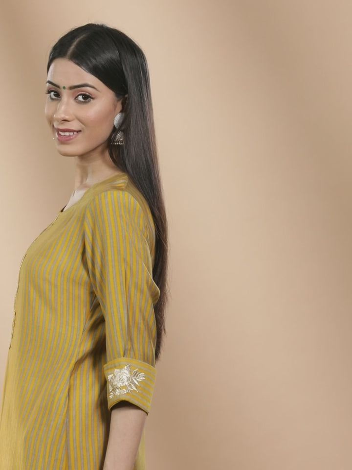 Our mustard yellow striped A-line Chanderi silk kurta features a round neckline, roomy pockets and three-quarter shirt sleeves. Adorned with embroidered accents, this refreshing style is ideal for daytime festivities.