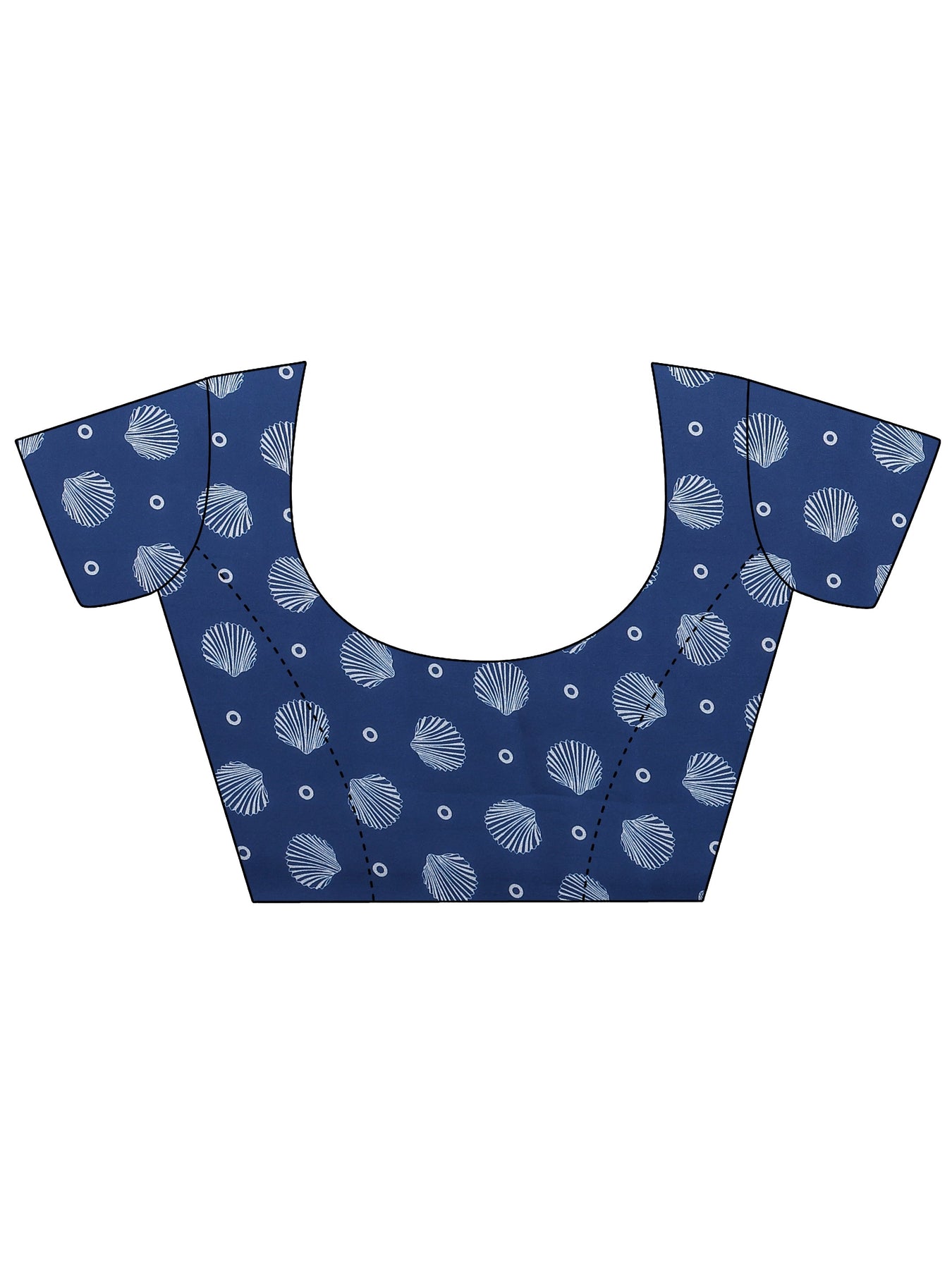 Our blue printed satin saree features captivating fish motifs. Complemented with a stitched blouse. This charming saree is perfect for festive occasions.