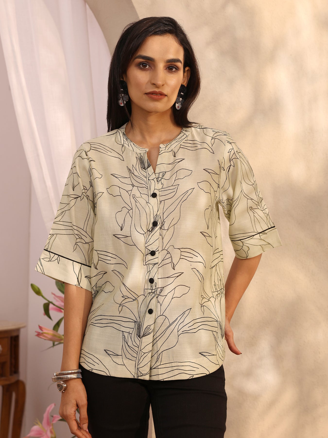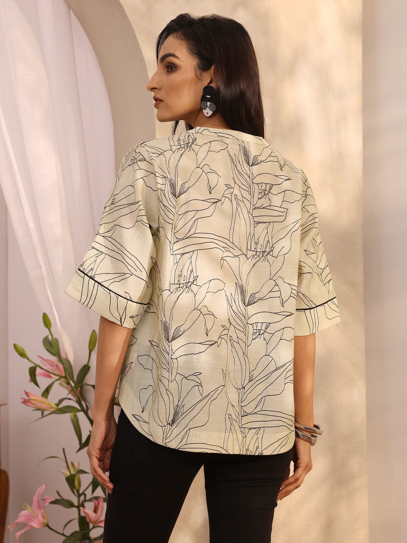 This summer, step into a whimsical wonderland of nostalgia with this 1-piece off white short kurti crafted in silk blend. Adorned with modern leafy prints in monochrome hues, the short kurti features Mandarin collar and flared elbow sleeves, making it perfect for formal occasions.