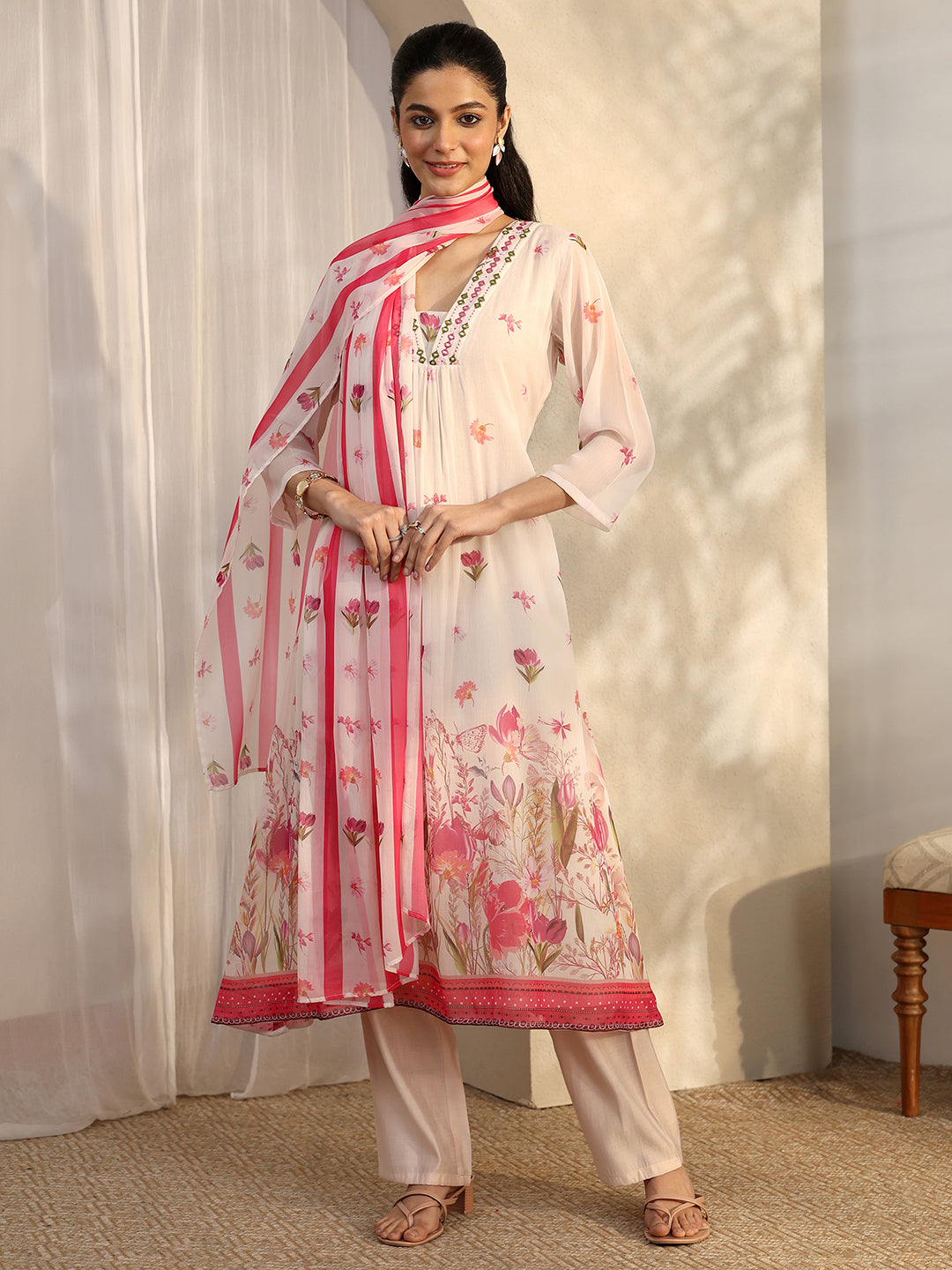 Off White Printed Chiffon A-Line Suit Set With Dupatta