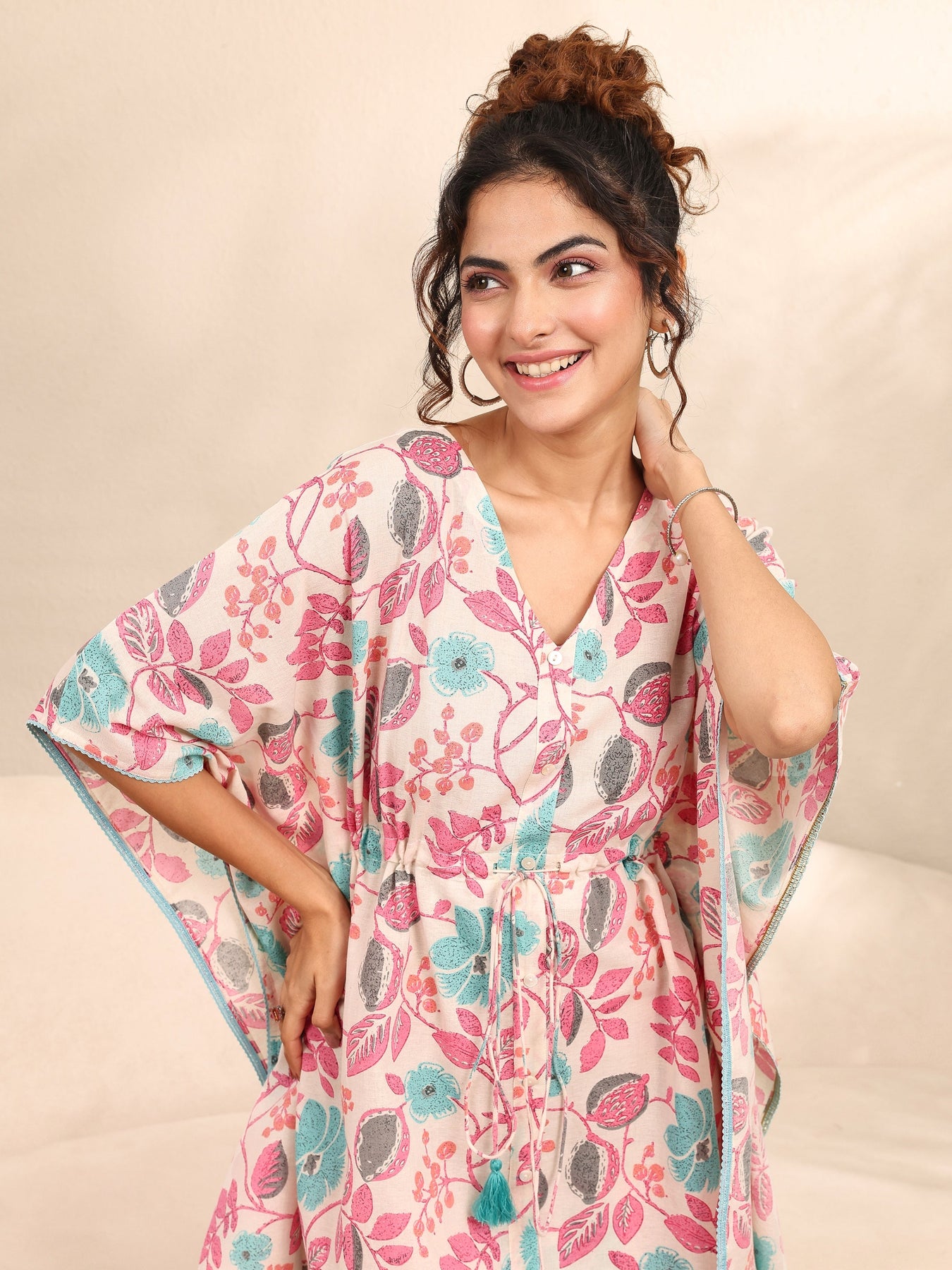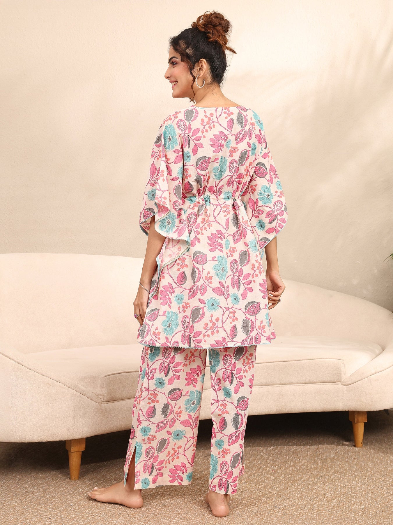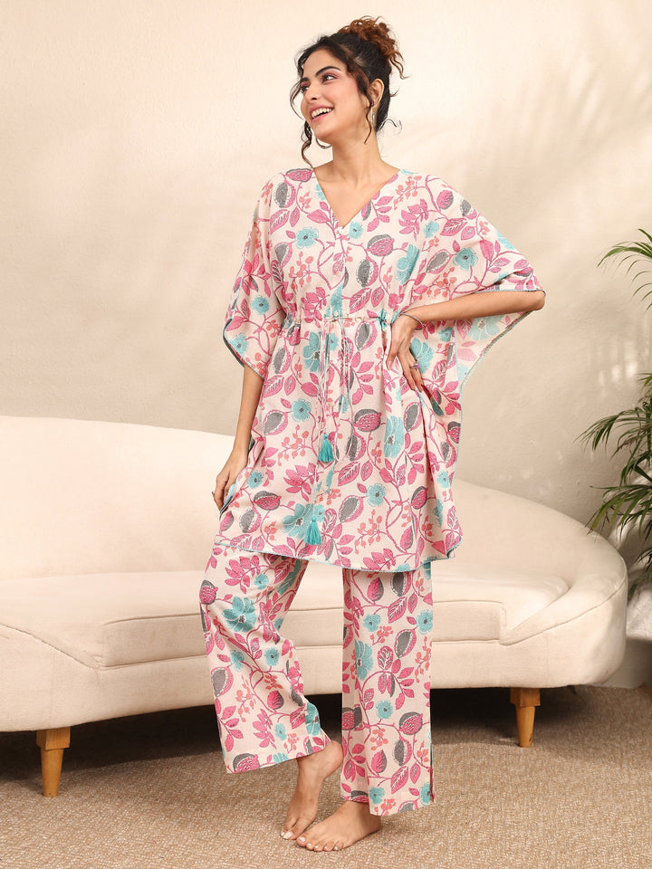 Our 2-piece Off White printed Cotton nightsuit features an Asymmetric Kaftan with a V-Neck neckline and Long Sleeves. Complemented with matching Pyjamas with a Partially Elasticated waistband and 2 pockets. Elevated with Top Print, this style is perfect for Night Wear.